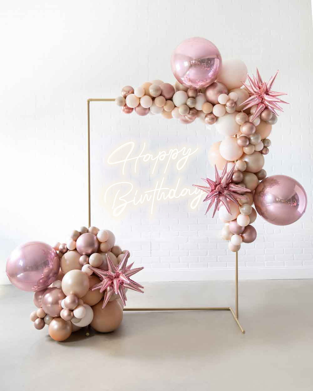 Light up your event with the ultimate backdrop! This balloon garland design includes balloons along a circular frame, as well as a beautiful neon sign to highlight your occasion in style! This works perfectly in any space and will wow your guests!