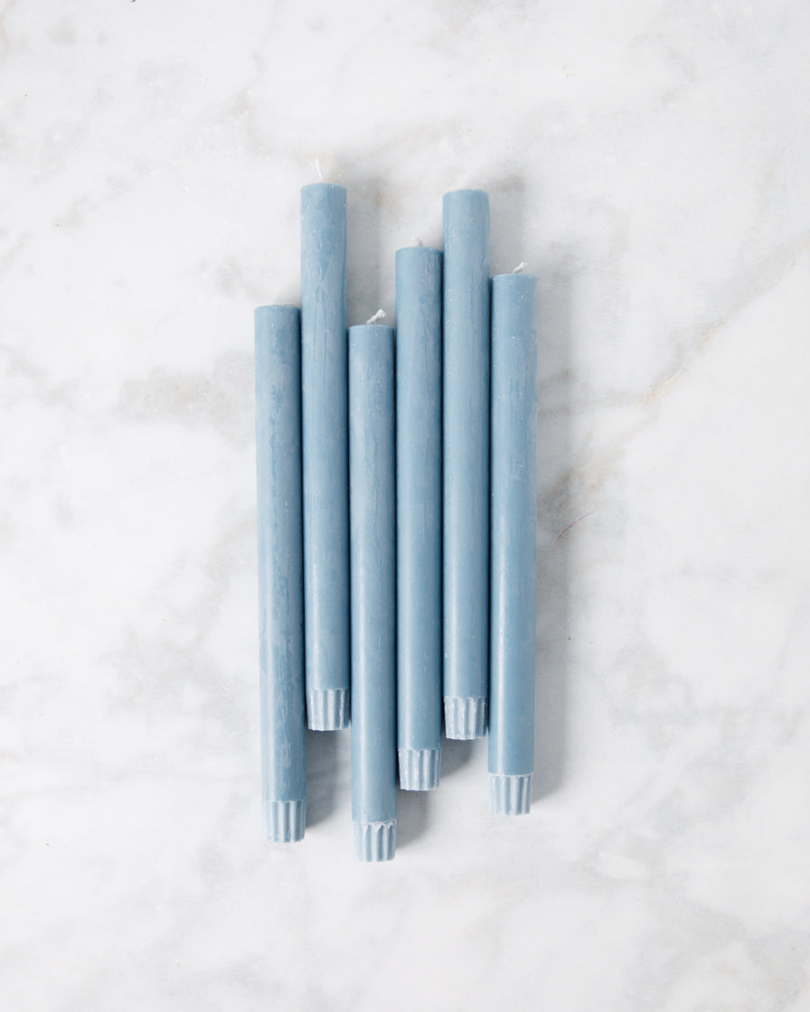 Eco and Fair Trade dinner candles, hand poured in British Colour Standard Pompadour Blue.