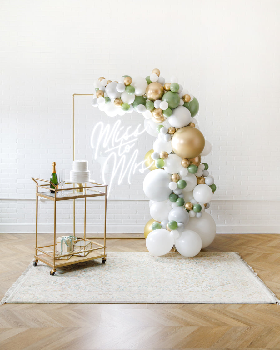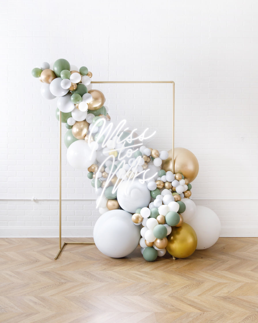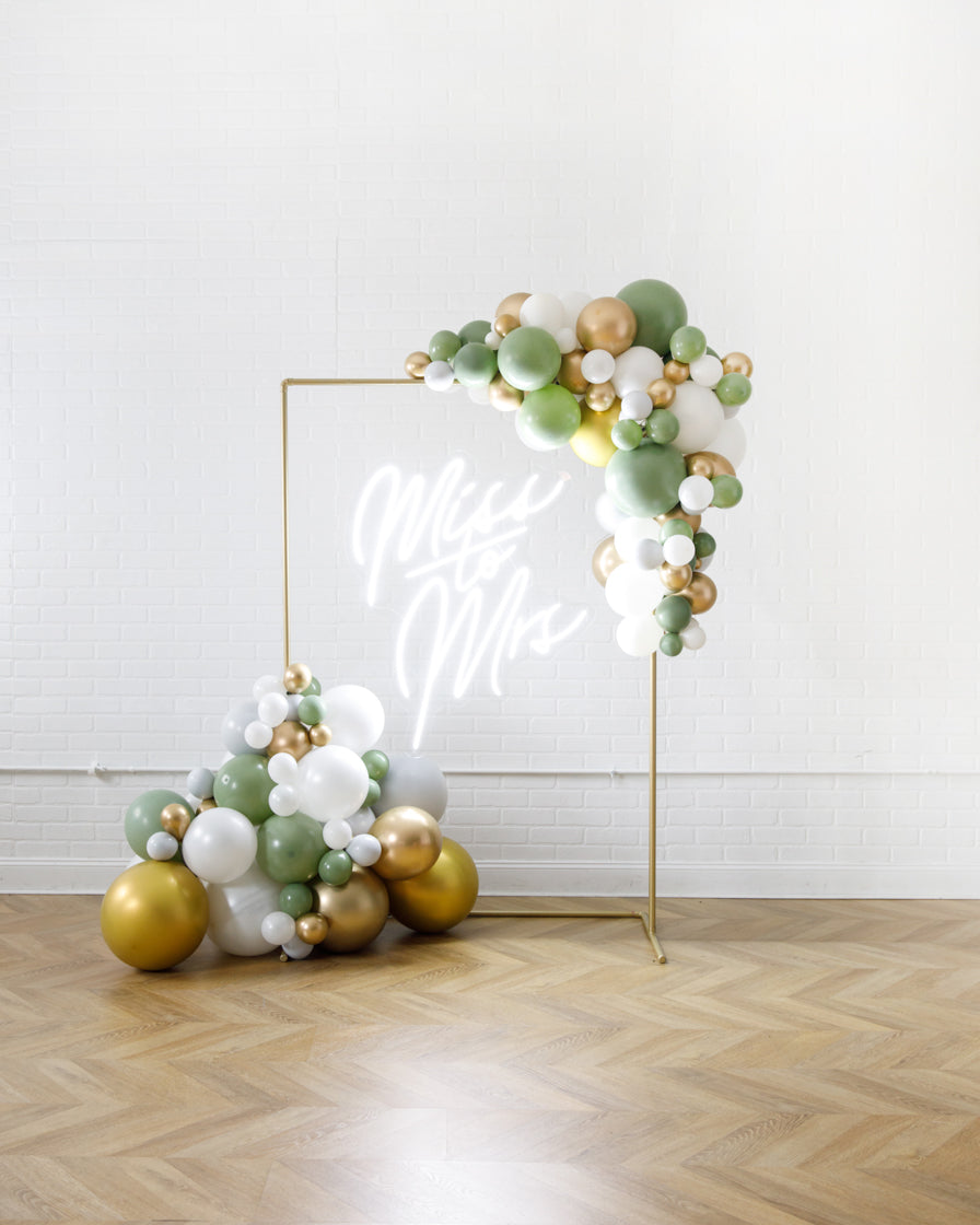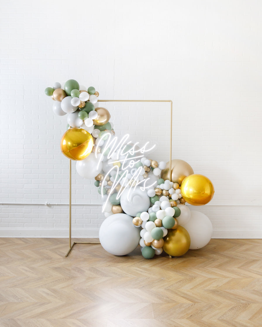 Light up your event with this neon sign, frame and balloon garland set! This picture perfect backdrop includes our Miss to Mrs neon sign, and an overflowing balloon garland draped around our small gold frame that creates a beautiful backdrop.