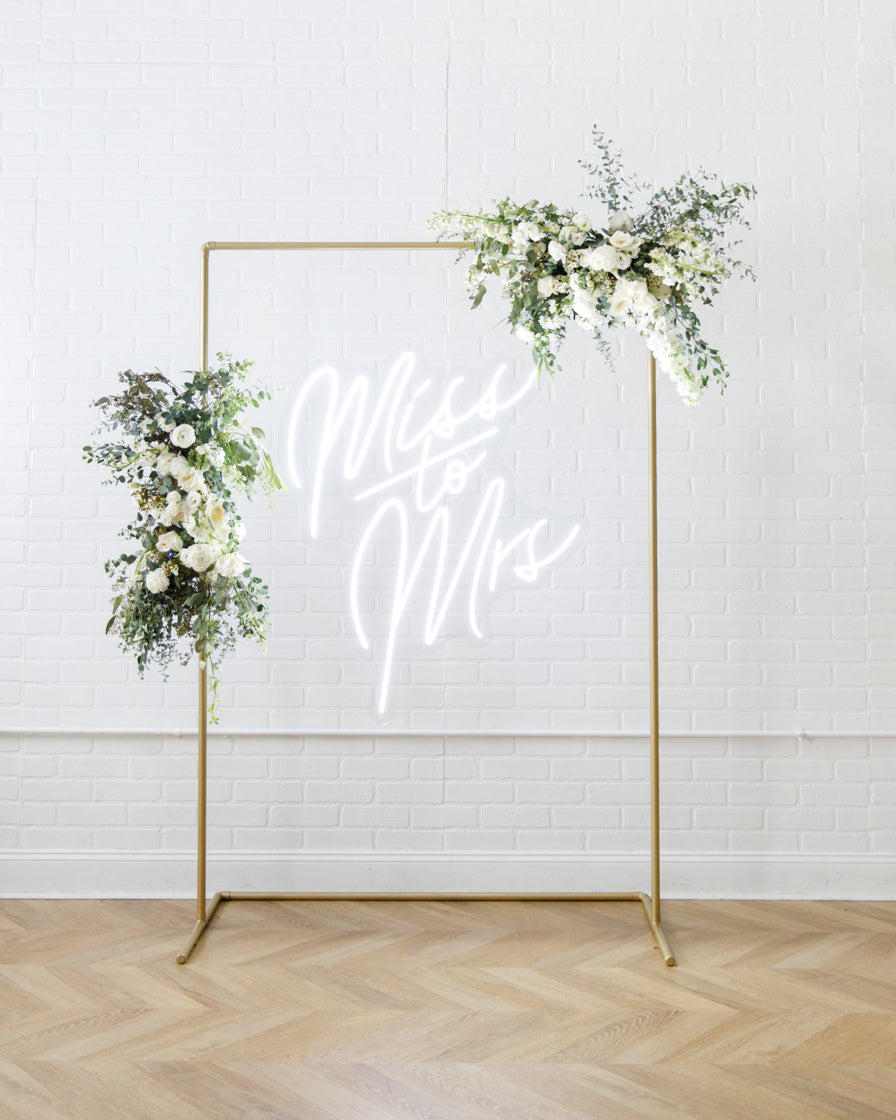 Elevate your event with this frame and floral pair. With our signature gold frame and two statement making floral arrangements. With our signature Miss to Mrs Neon sign, her event will truly light up. This works perfect for a Photo Backdrops, gift opening, or an entryway.