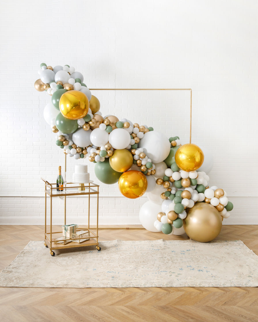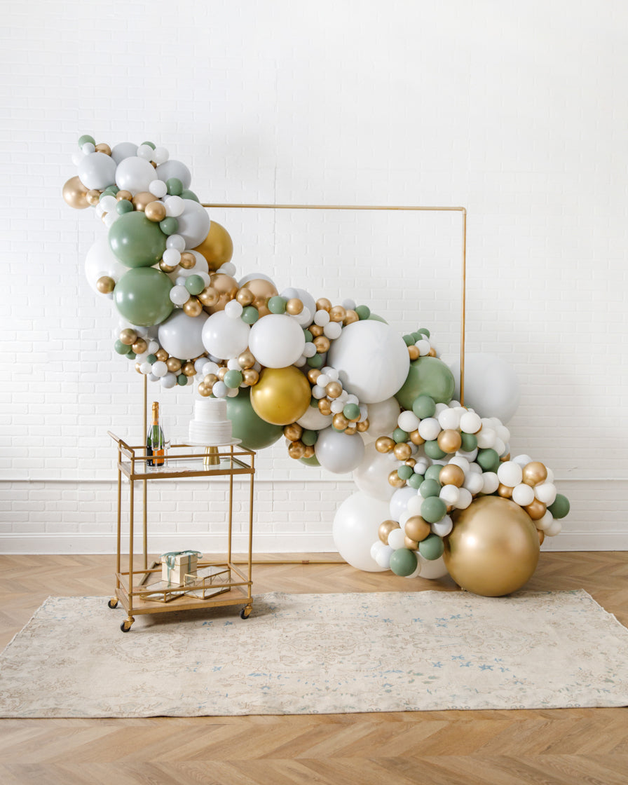 Celebrate boldly with our signature gold frame and diagonal organic garland design! This includes a full balloon garland cascading across the frame, perfect for photos. With added foils, it's an even grander affair!