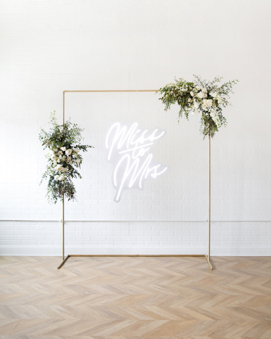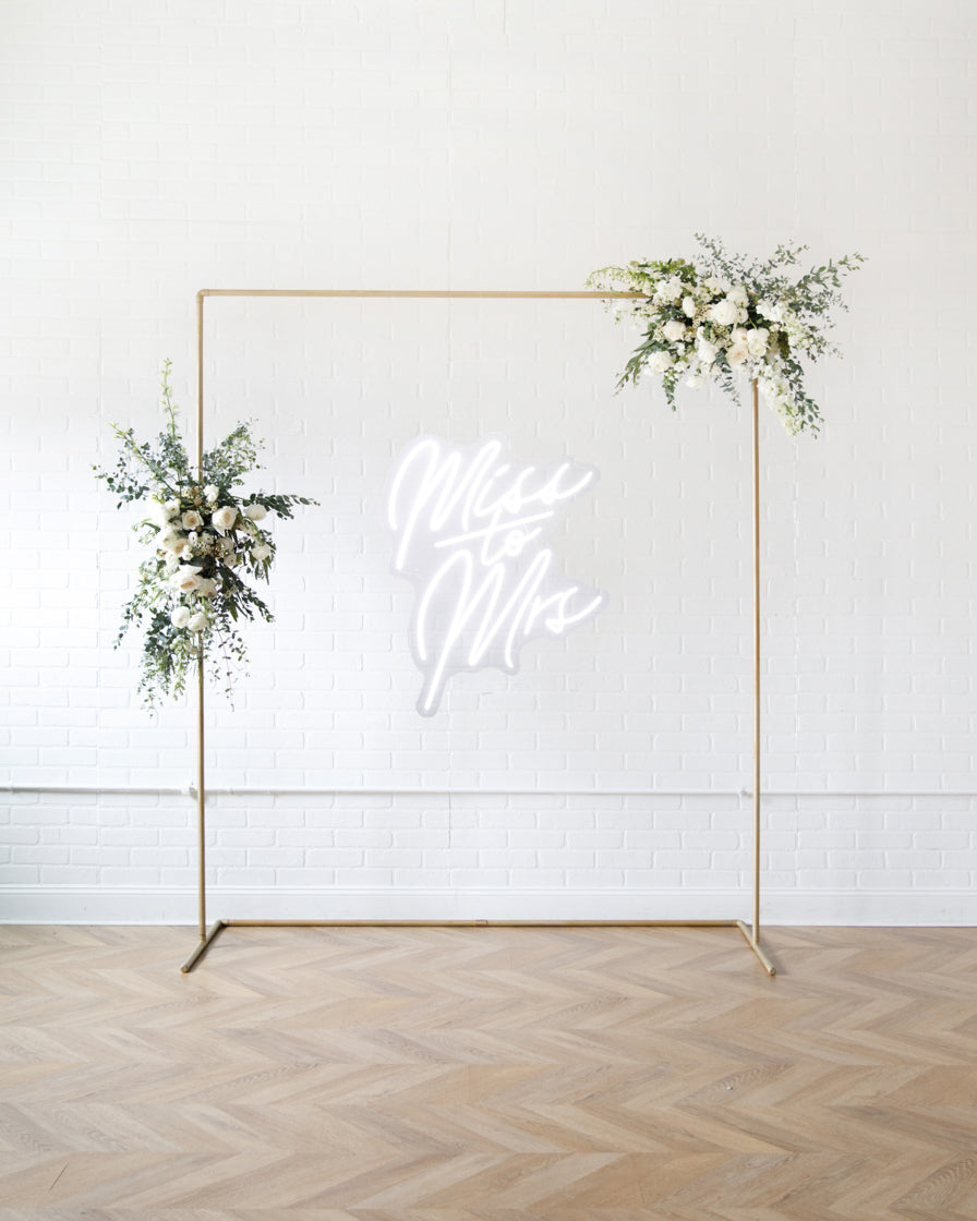 Elevate your event with this frame and floral pair. With our signature gold frame and two statement making floral arrangements. With our signature Miss to Mrs Neon sign, her event will truly light up. This works perfect for a Photo Backdrops, gift opening, or an entryway.