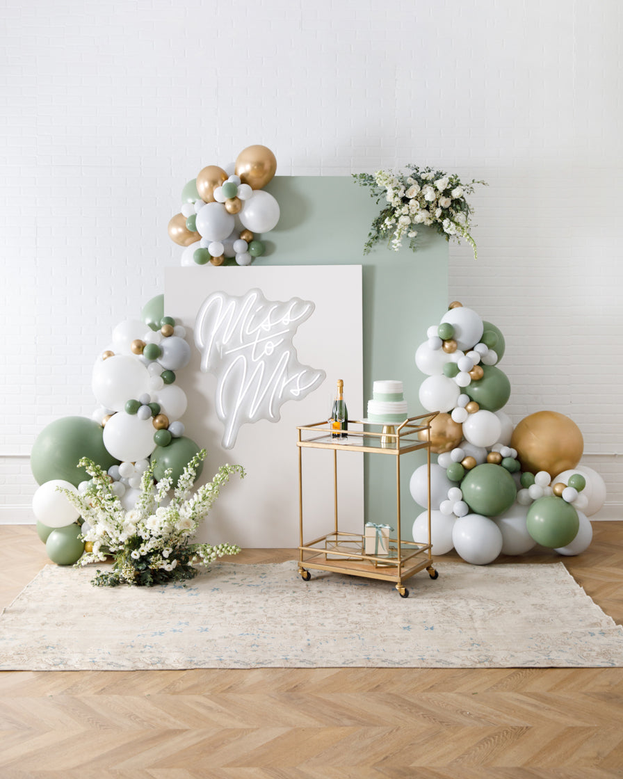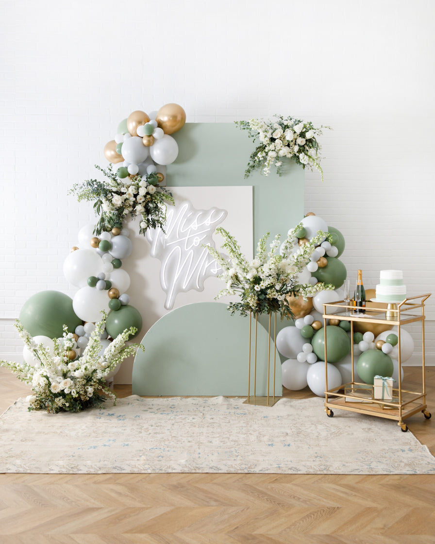 Create a breathtaking moment for your bridal celebration with this panel and floral design. With unique floral pieces and a balloon garland, your guest will fall in love with this unique backdrop. Our signature Miss to Mrs Neon adds a bright touch to this stunning design.