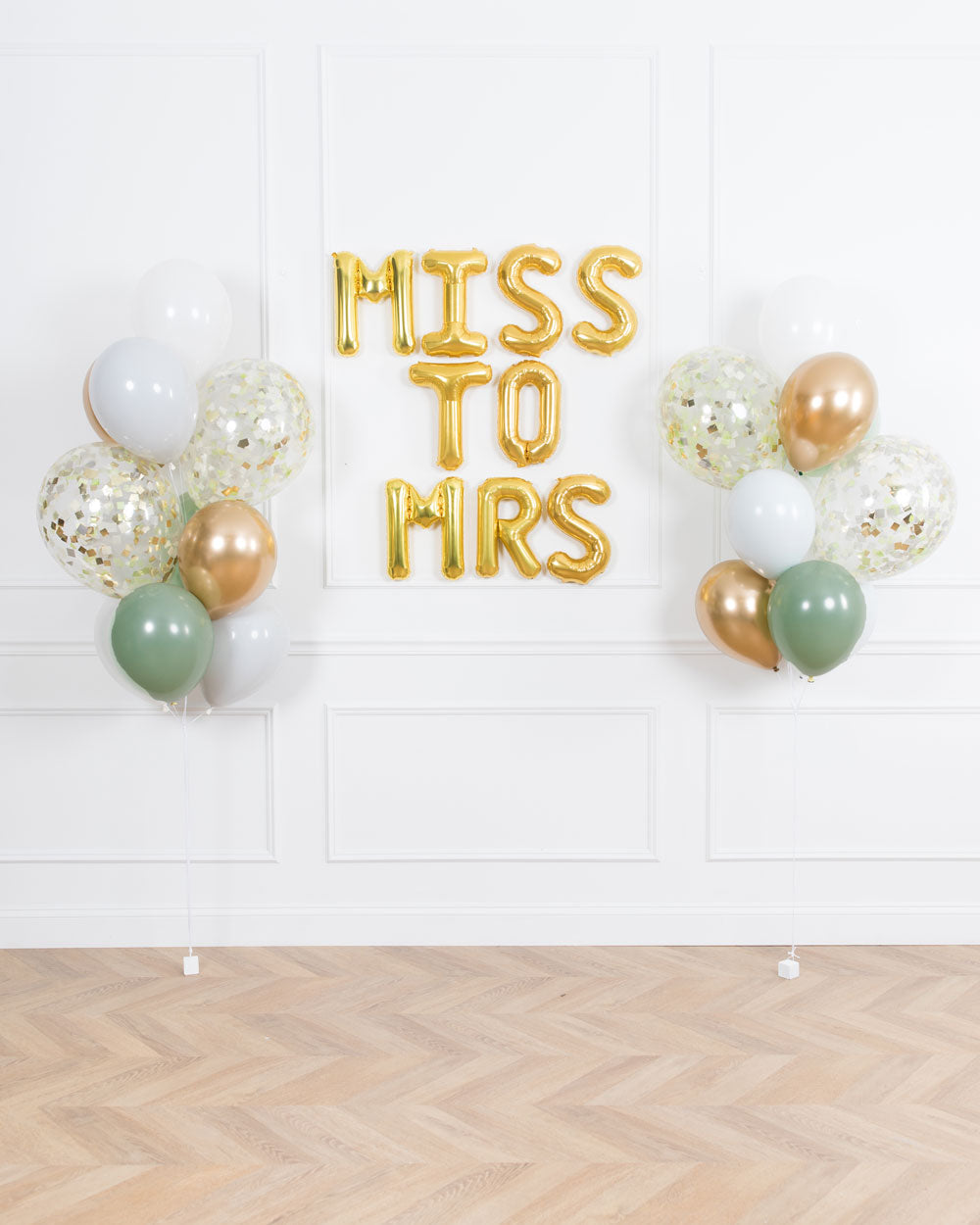 Fill the room with this Blushing inspired balloon set! This includes 2 confetti balloon bouquets and rose gold letters spelling out Miss to Mrs to create an easy and festive backdrop.