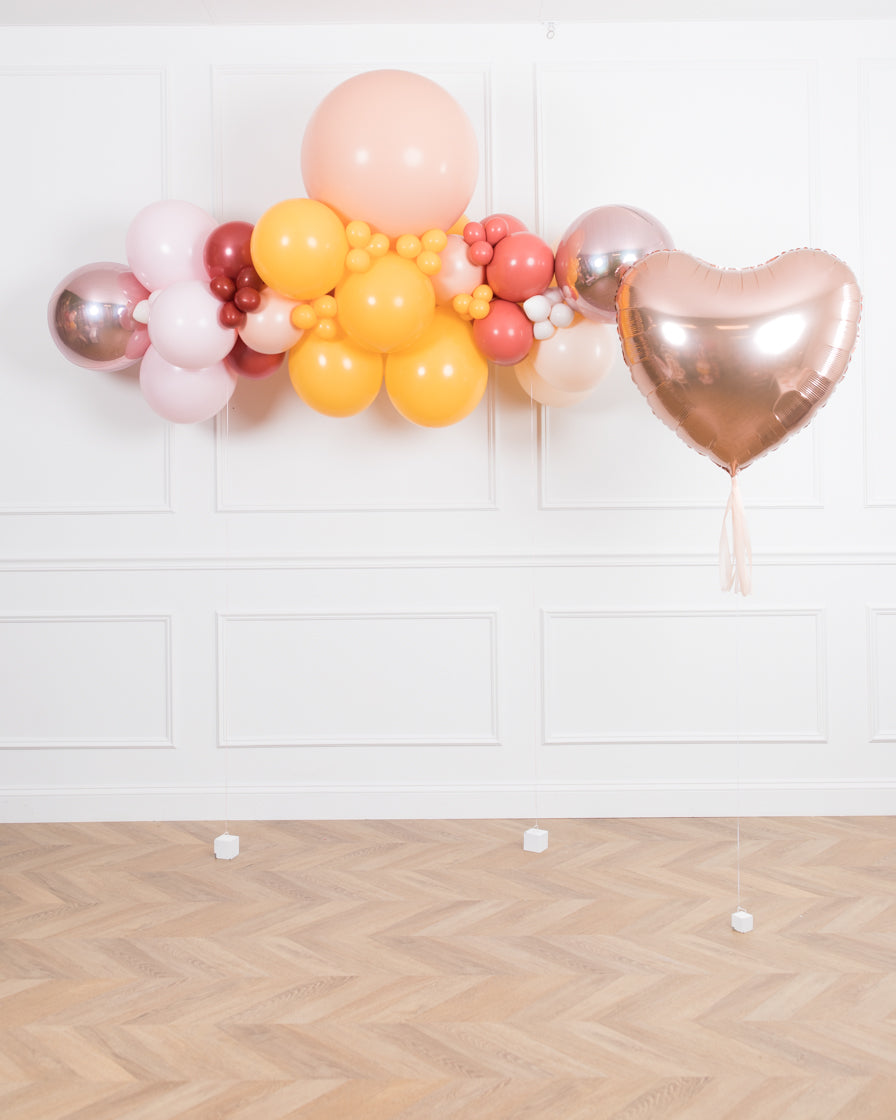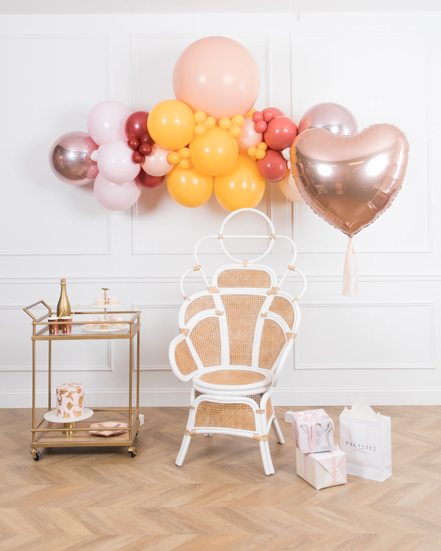 Put the ultimate party together with this balloon birthday set. This set includes a floating balloon arch and rose gold foil heart. In dusty rainbow shades, this works perfectly for a bohemian themed event.