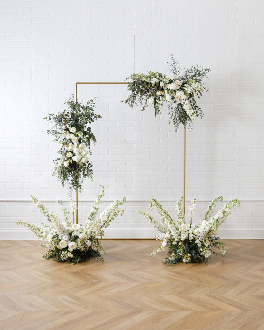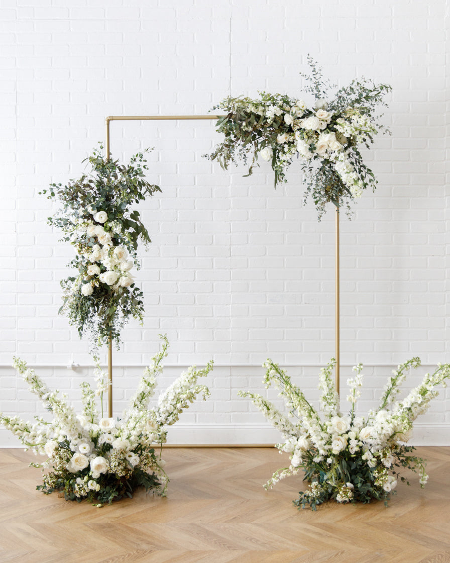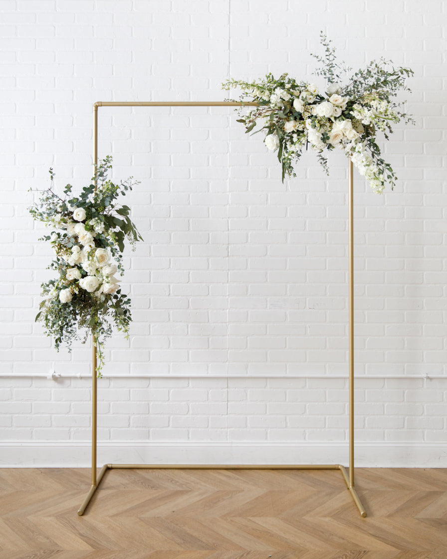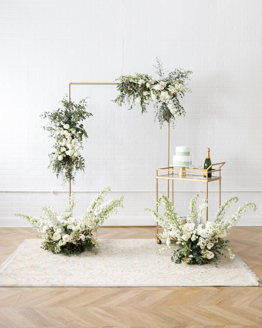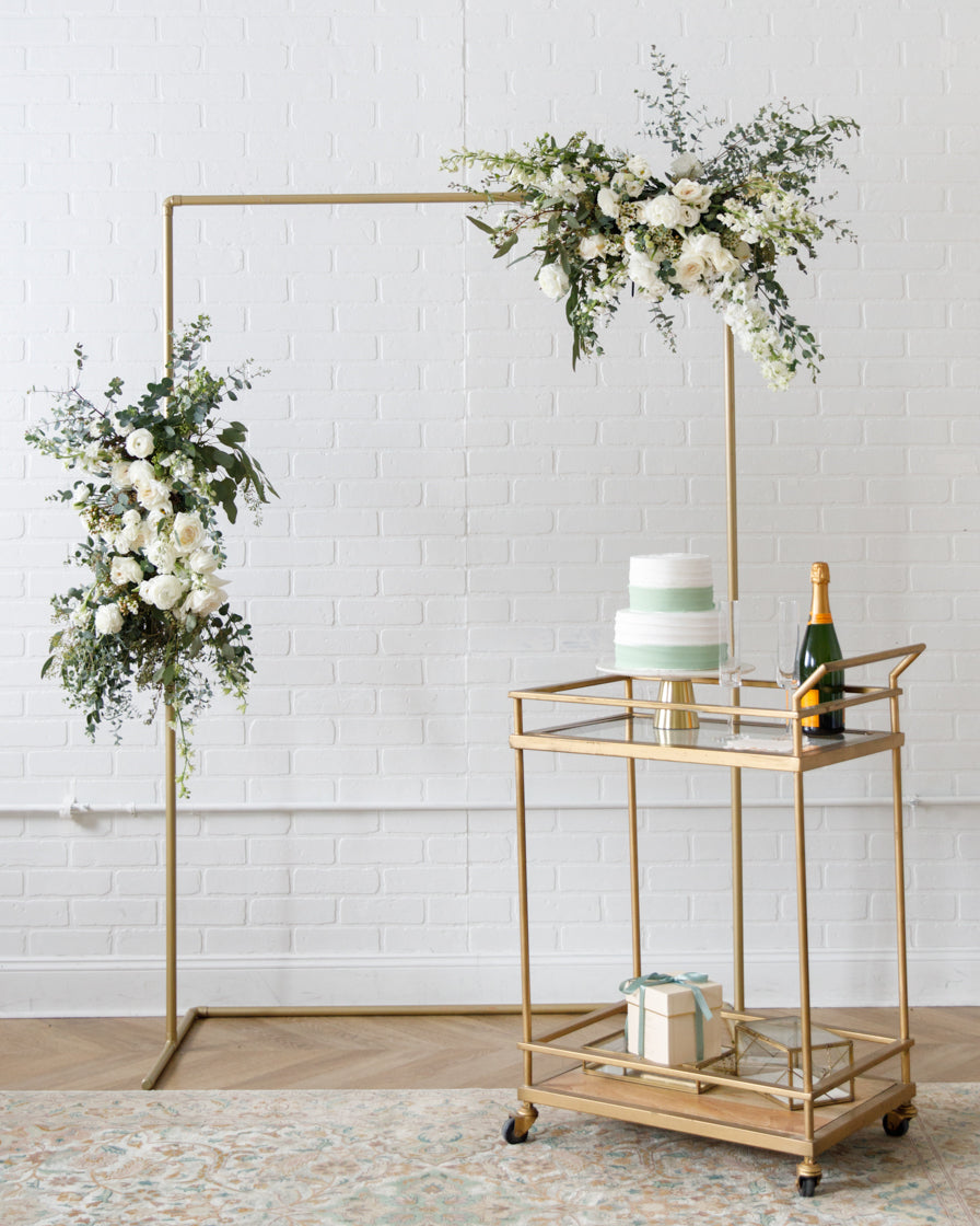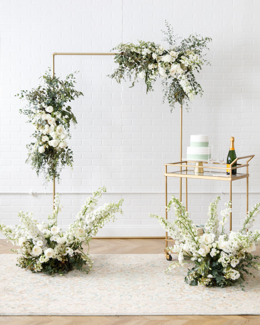 Elevate your event with this frame and floral pair. With our signature gold frame and two statement making floral arrangements, this works perfect for a Photo Backdrops, gift opening, or an entryway.