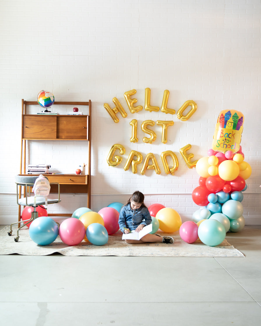 Start off the new school year in style! This includes a banner to welcome them to their class, an adorable back to school pencil column and floor balloons in bright colors. These bright hues will bring brighter smiles to students ready for the year ahead!