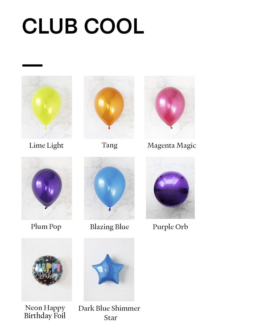 Balloon- lime light, magenta magic, tang, blazing blue, plum pop