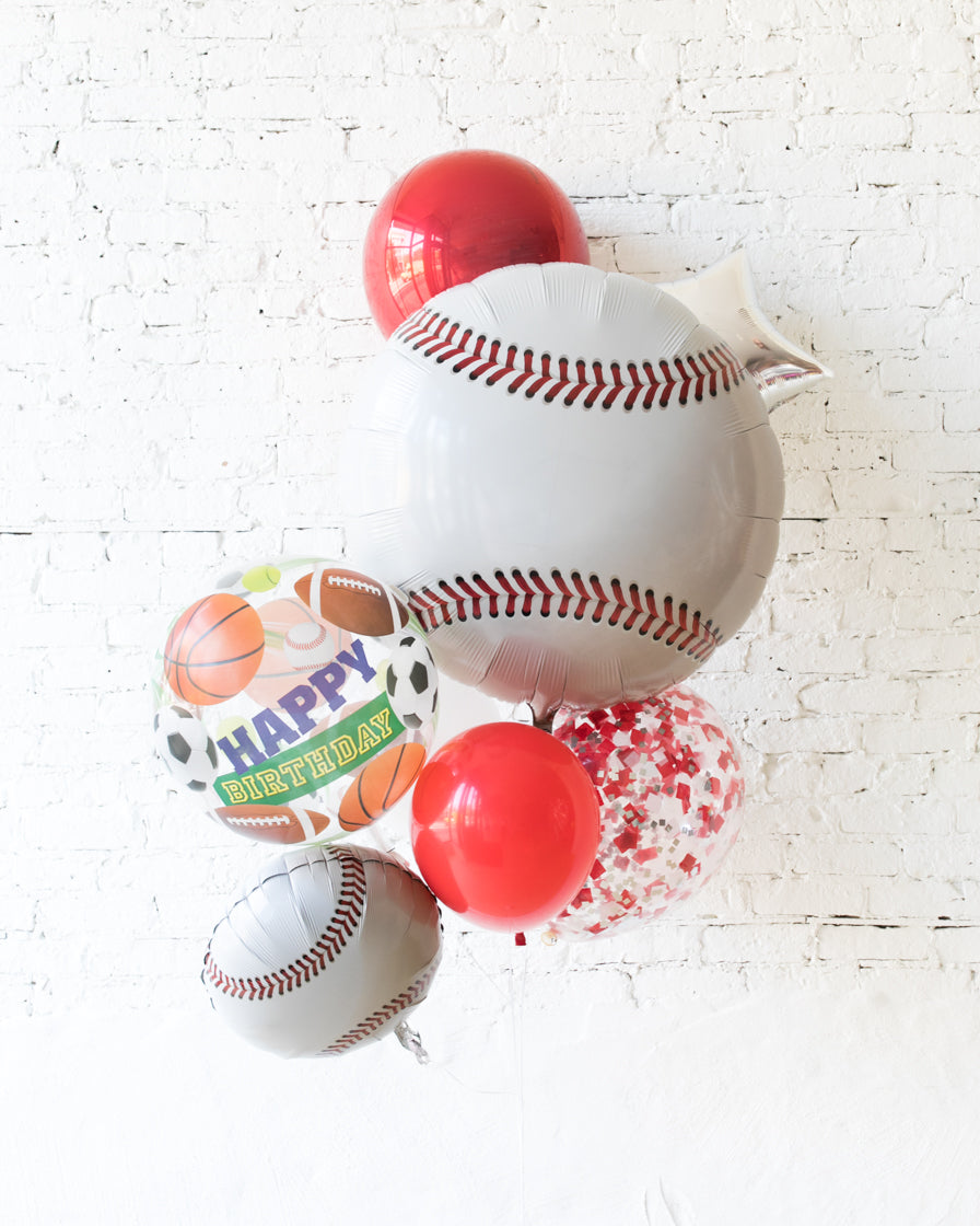 Balloons - clear with confetti, clear Happy Birthday sport theme design, red and white