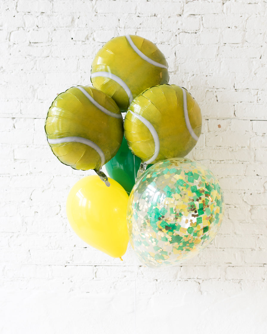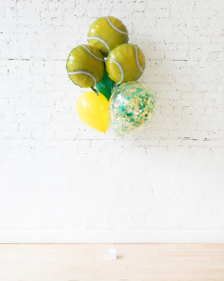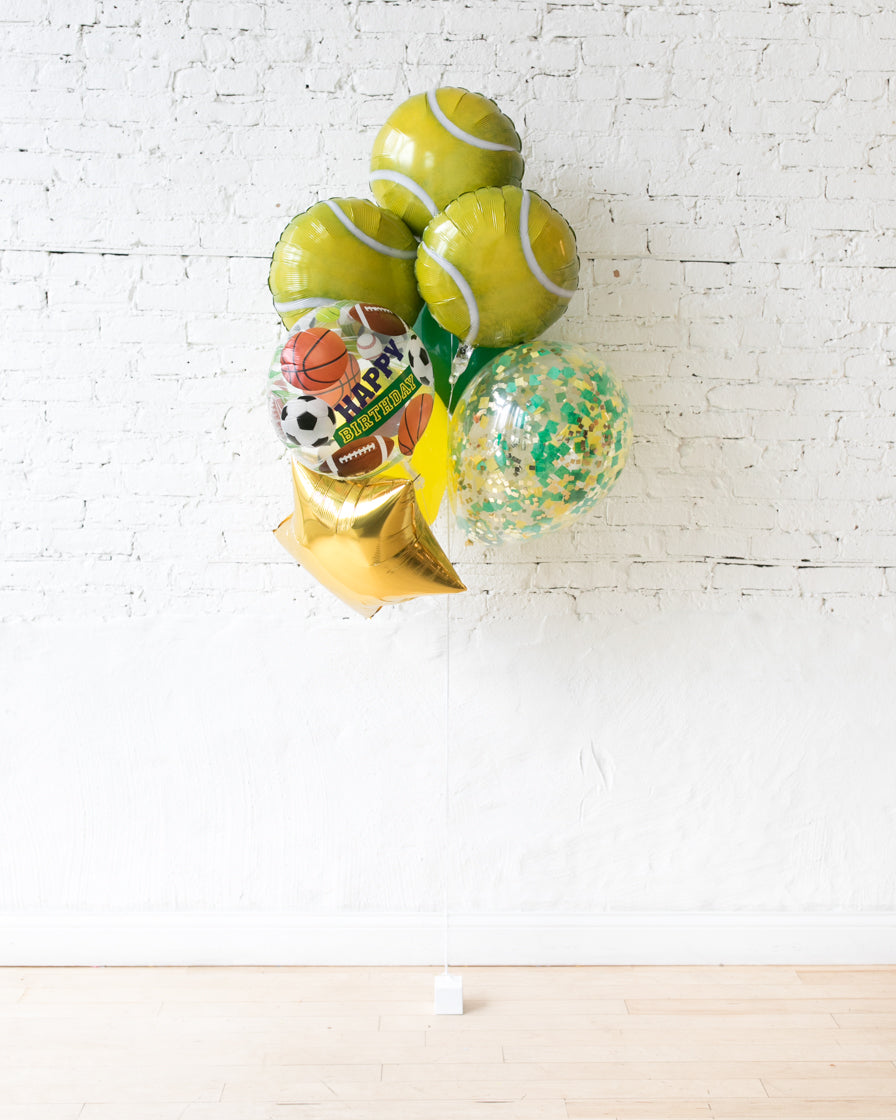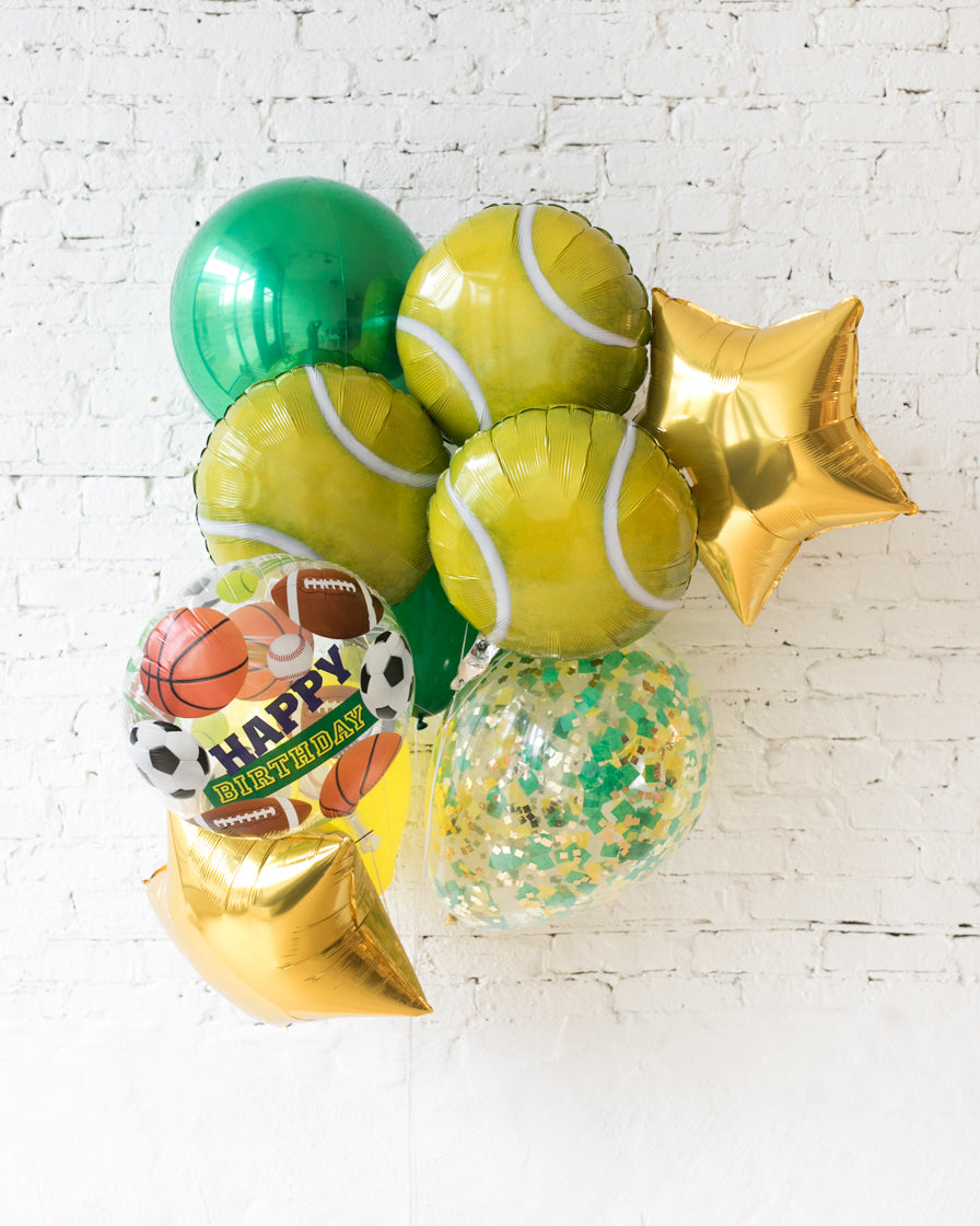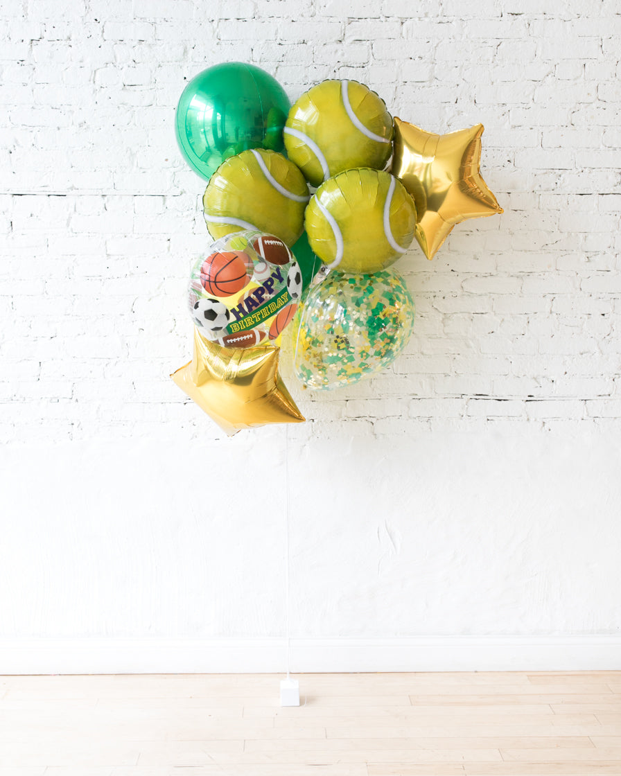 Balloons - clear Happy Birthday Sports Theme design, clear with confetti, yellow and green