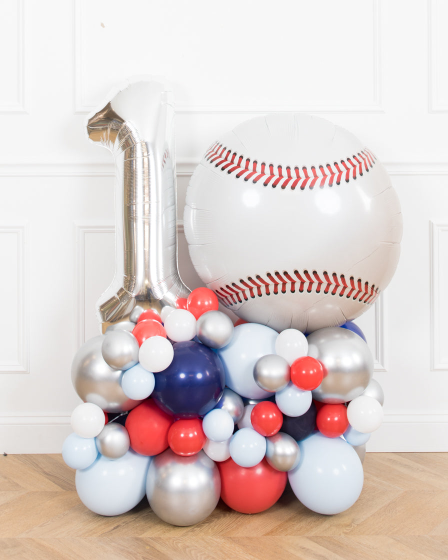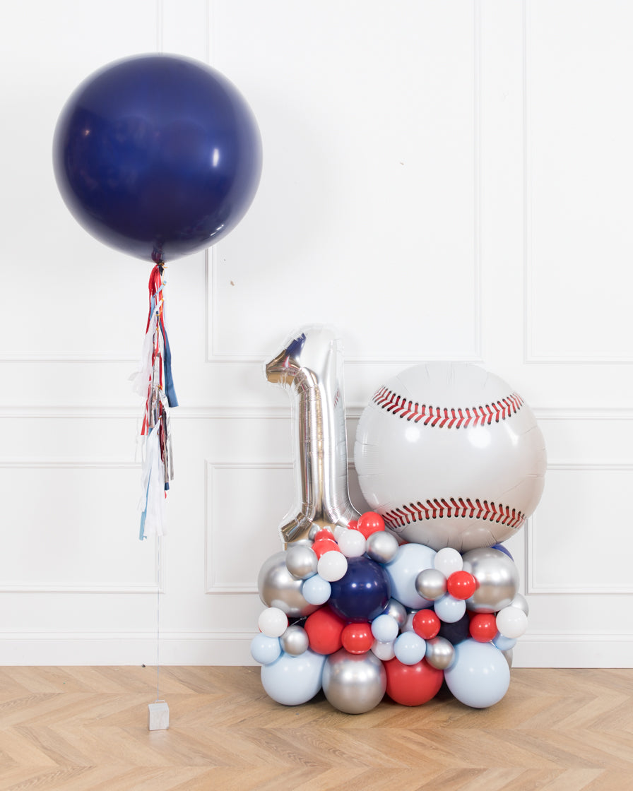 Make a bold statement for a baseball themed 1st birthday! Use this giant balloon with tassel garland and birthday pedestal to dress up any space! This design includes a silver number and navy giant balloon.