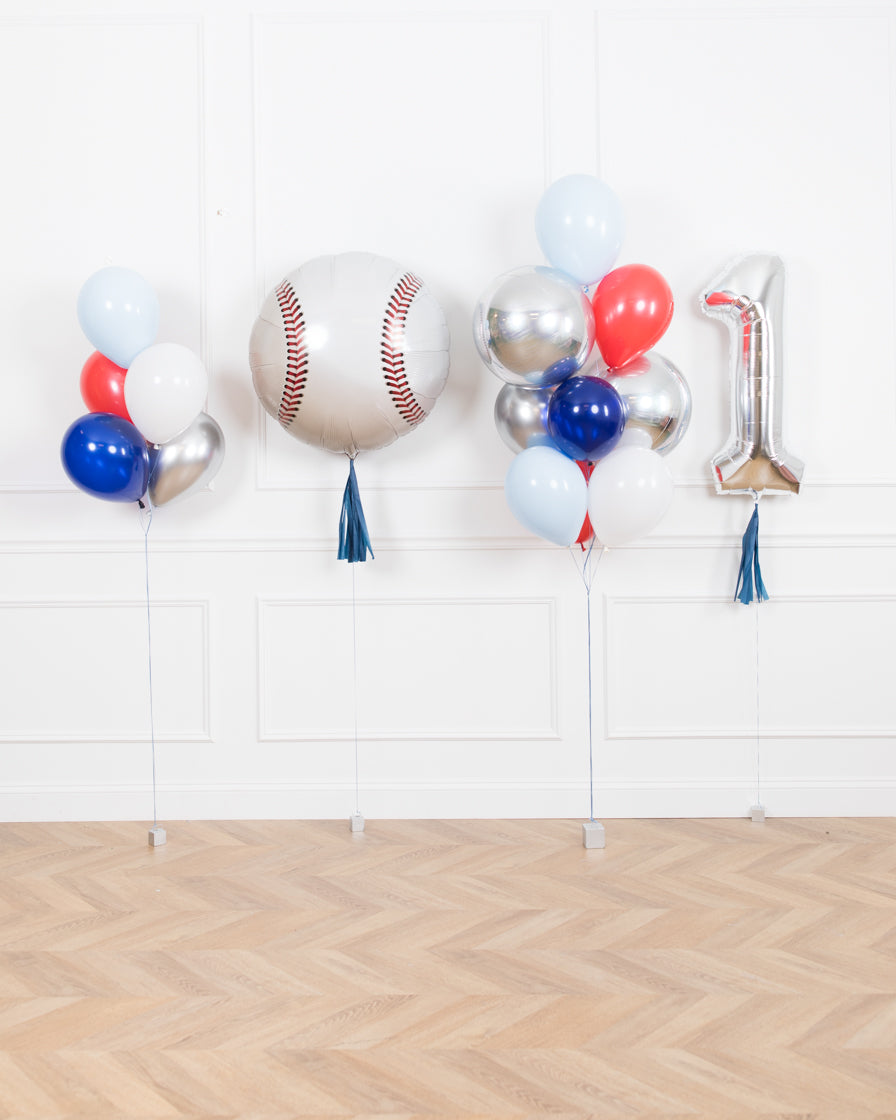 Create an extra fun celebration with this adorable party set. This include a foil baseball balloon, two balloon bouquets and a silver number one balloon with navy tassel skirt. Use this around the room of any space for extra fun birthday decor.