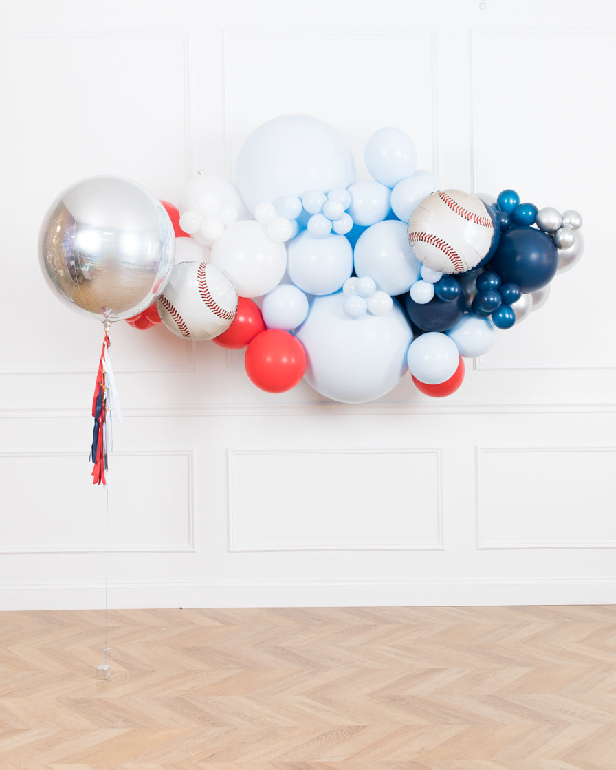 Create a fun first birthday with this baseball themed set. This includes a 6ft floating balloon garland and silver orb balloon. Use this anywhere to create an instant party.