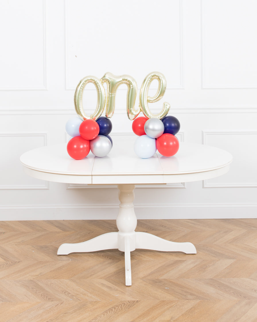 Dress up the table with a bold birthday decoration. This easy table decor includes a white gold one script balloon to celebrate a first birthday and air filled latex balloons in bright shades for a fun look.