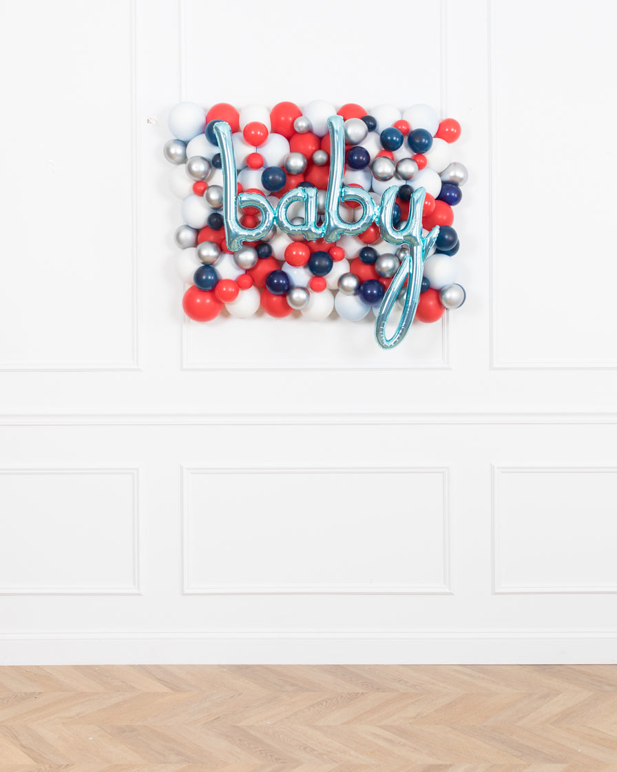 Our fun balloon backdrop boards add pop to any photo op. This 30"x40" piece includes an air-filled blue baby script balloon and colorful balloons designed in a baseball palette. Place above sweet's table or on photo backdrop wall. Complete the look with matching balloon bouquets.