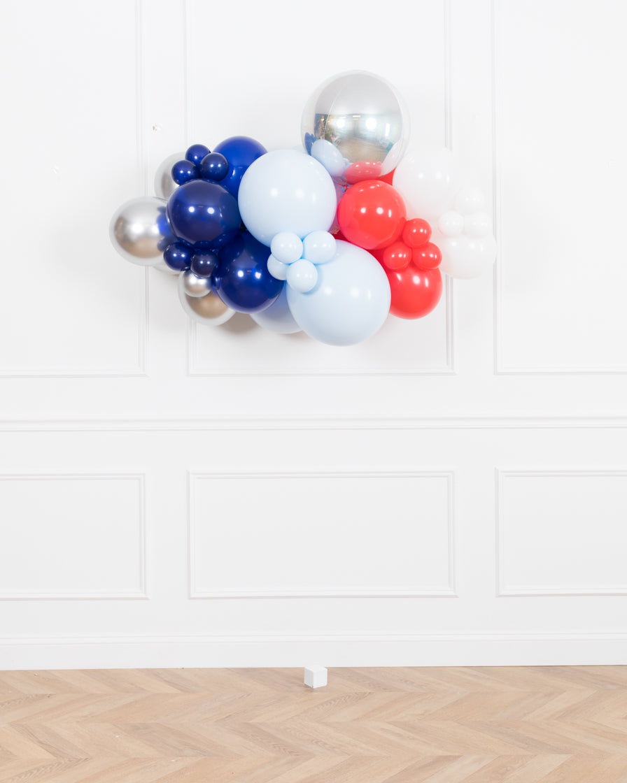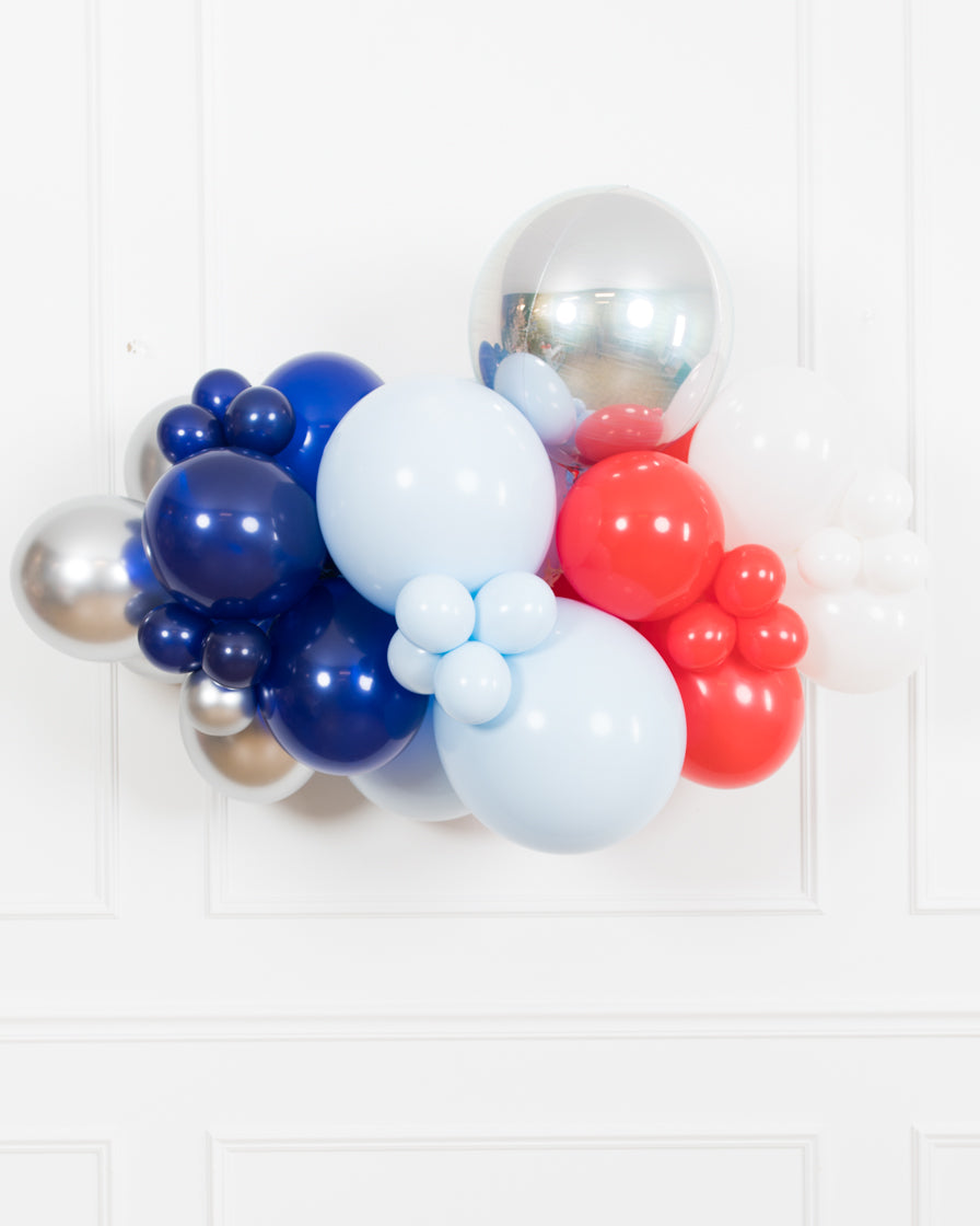 Make a statement with our 6ft floating balloon garland. This helium-filled garland includes navy, pale blue, red and silver colors, perfect for a baseball themed shower.