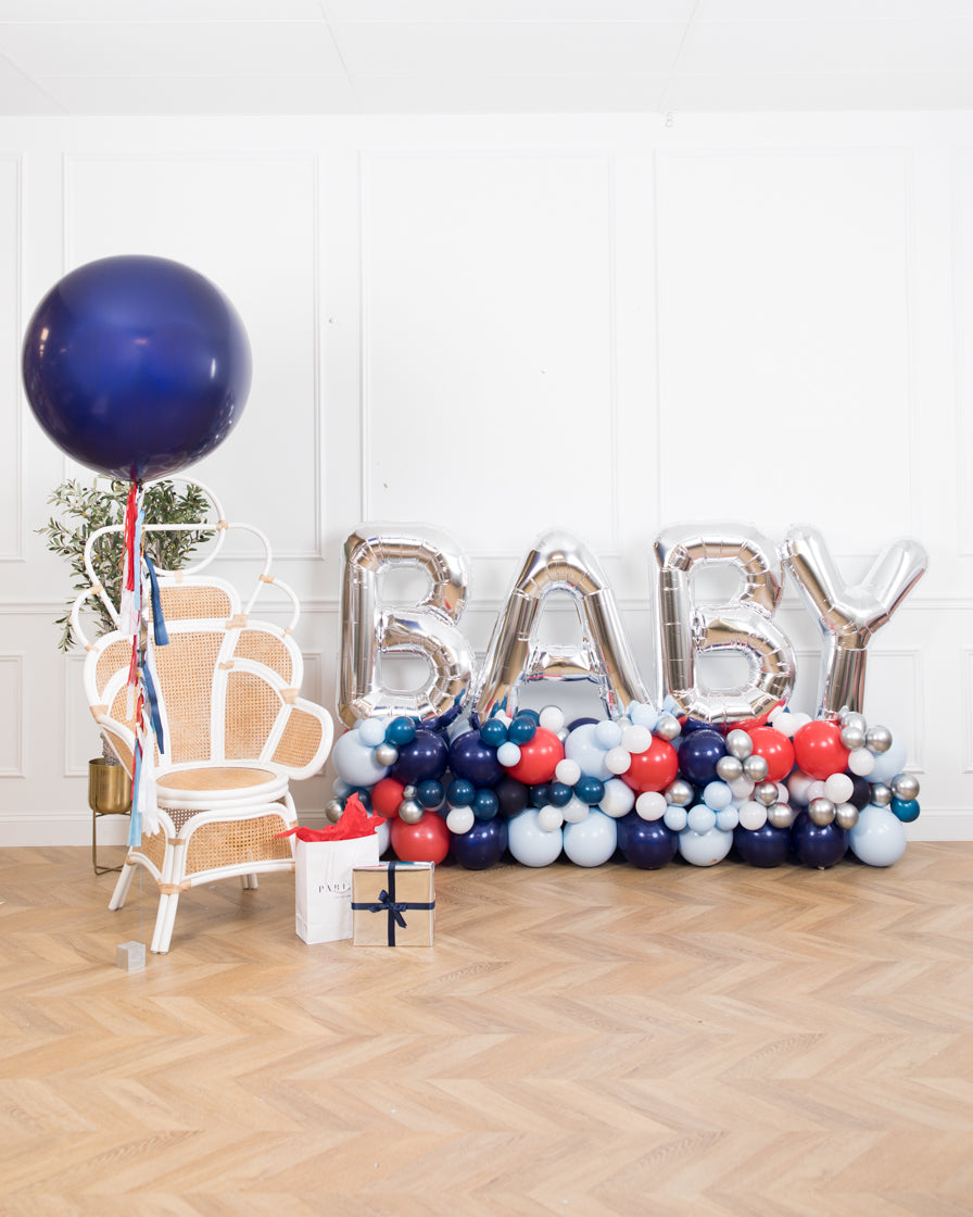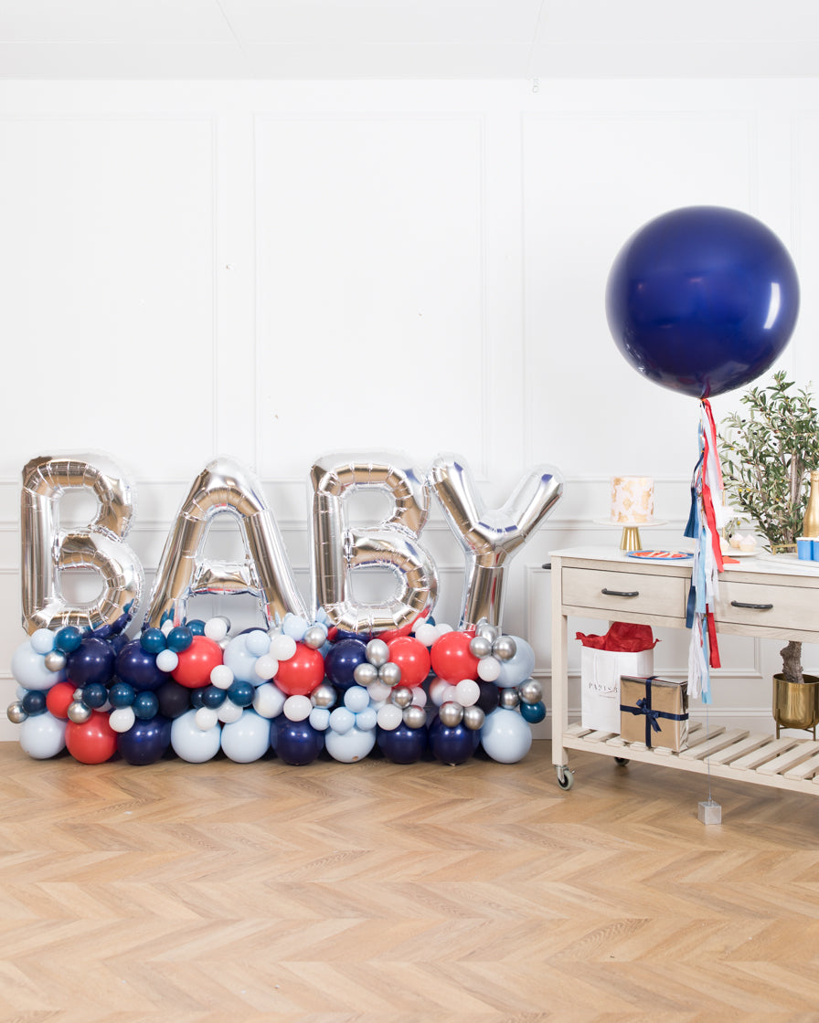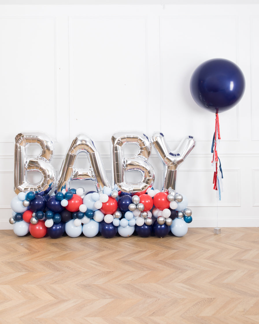 Make a bold and beautiful statement for baseball themed shower! Use this giant balloon with tassel garland and baby pedestal to dress up any space! This design includes silver letters and baseball inspired balloons.