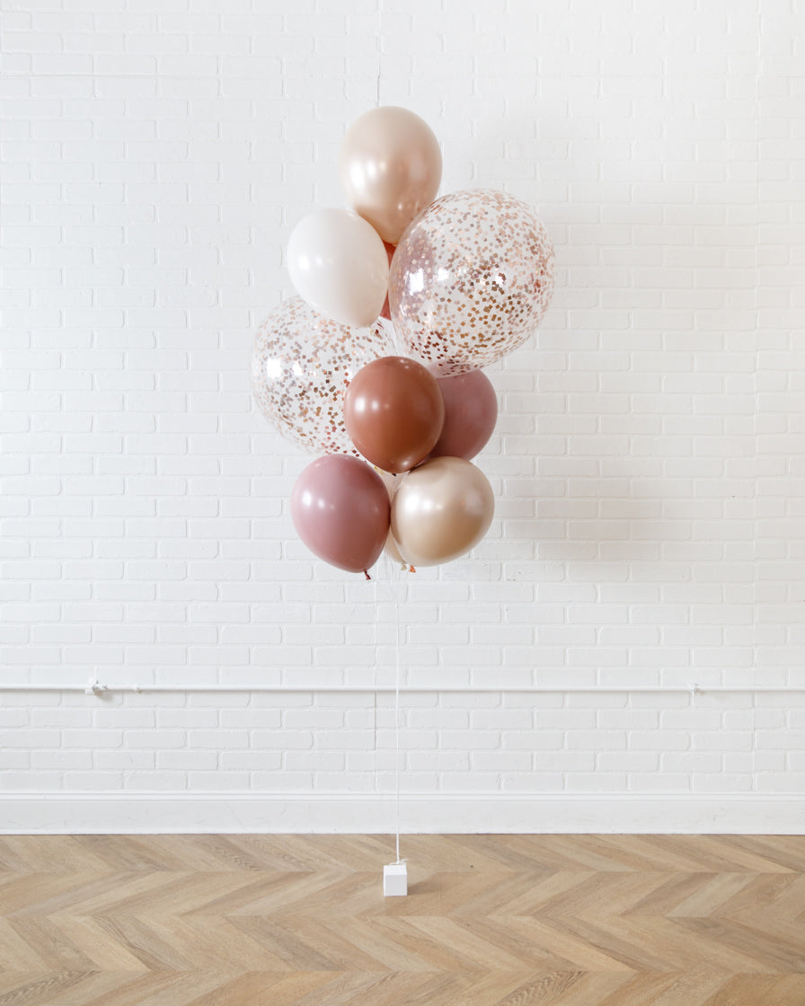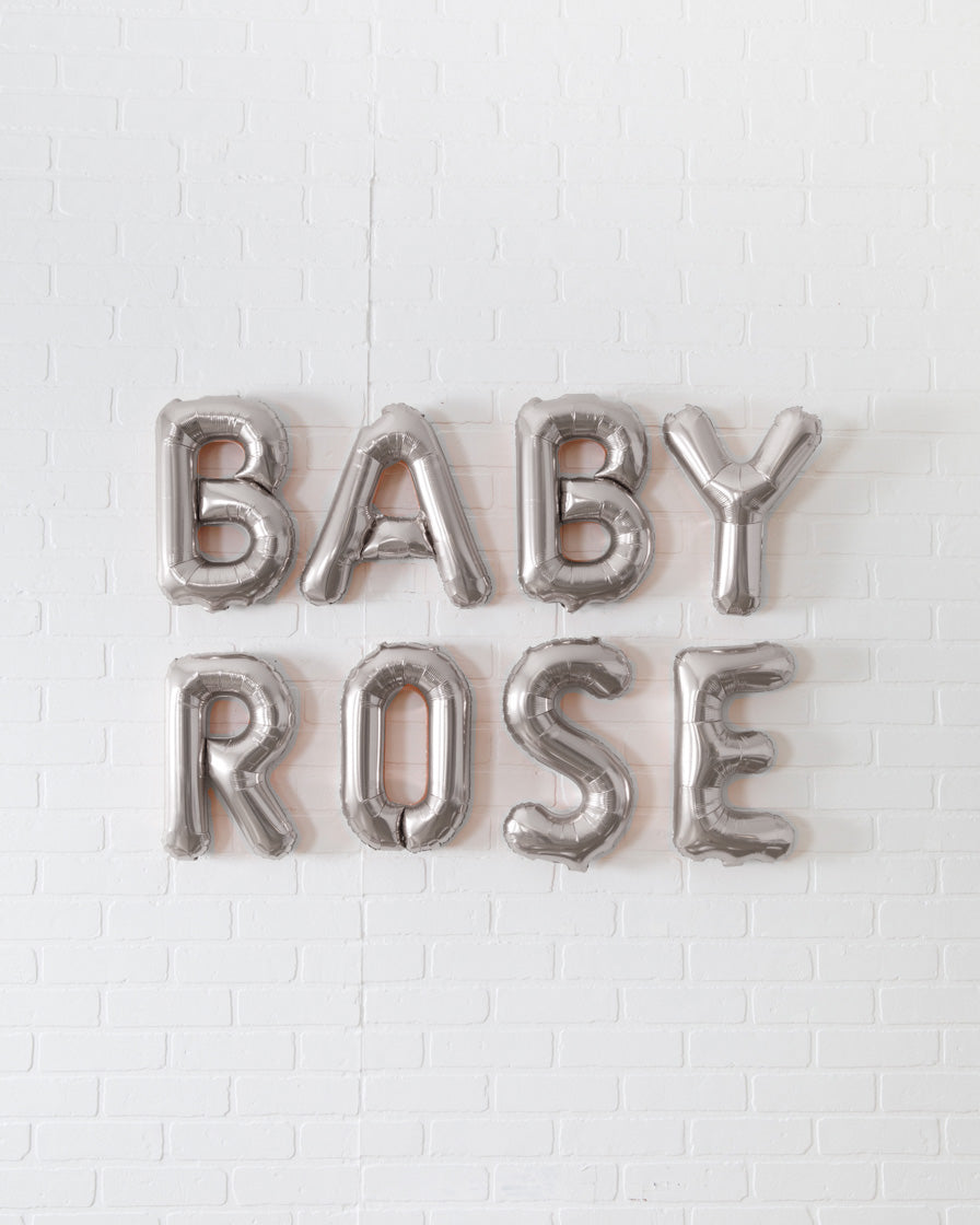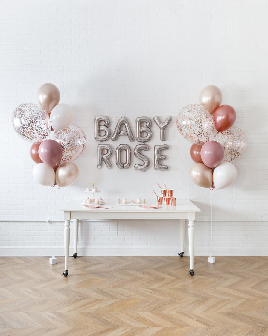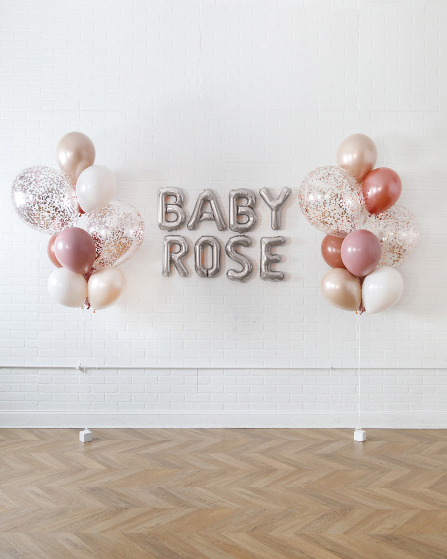 Fill the room with this super sweet balloon set! This includes 2 confetti balloon bouquets and baby name rose gold letters to create an easy and festive backdrop.