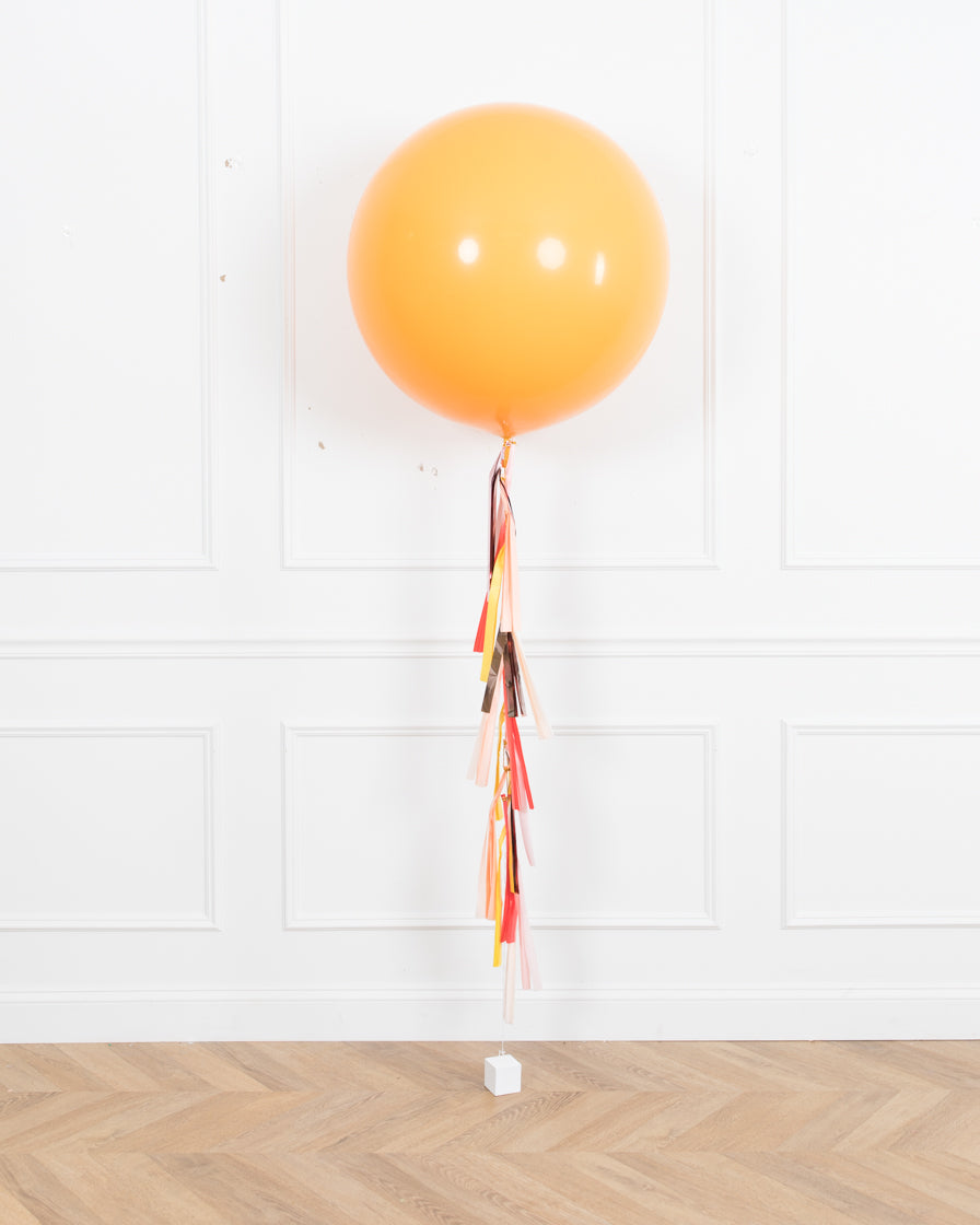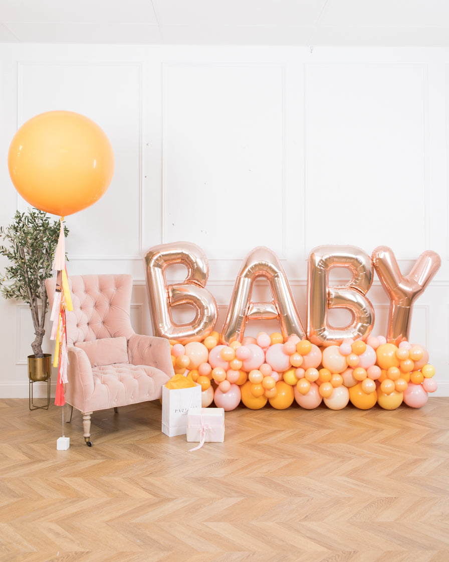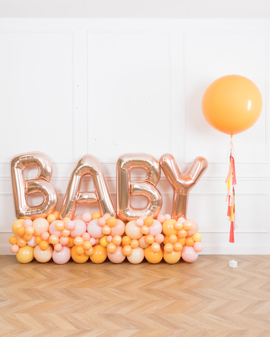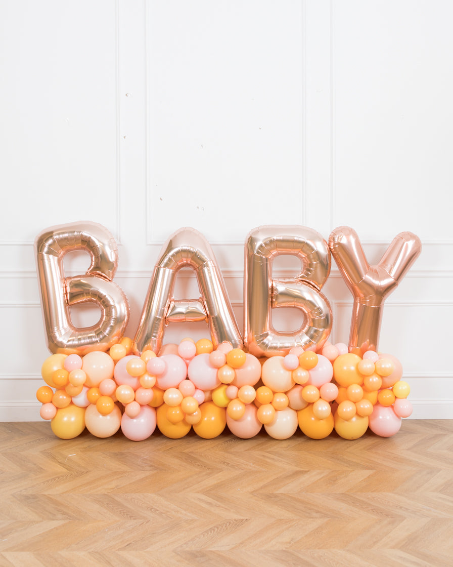 Make a bold and beautiful statement for citrus themed shower! Use this giant balloon with tassel garland and baby pedestal to dress up any space! This design includes rose gold letters and citrus inspired balloons.