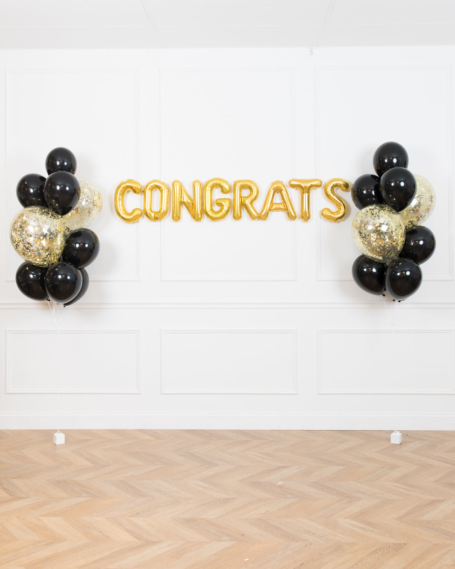 Fill the room with this super fun balloon set! This includes 2 confetti balloon bouquets and metallic letters spelling out congrats to create an easy and festive backdrop for any office or staff milestone celebration.
