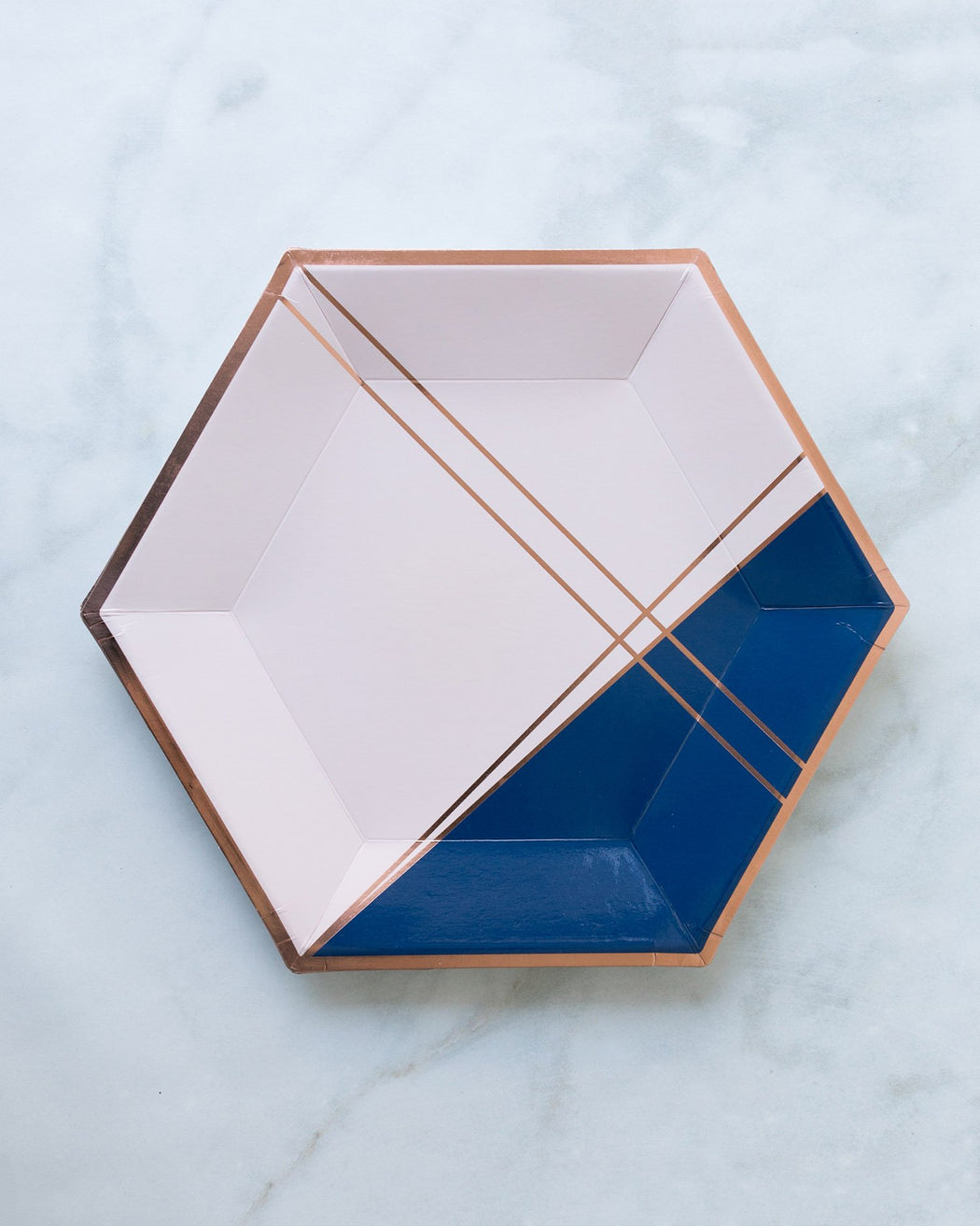 A modern, graceful color Palette inset with fine rose gold trim, elevate your party with these colorblock hexagon party plates. Perfect for bridal showers, special birthdays, or gender reveal parties!