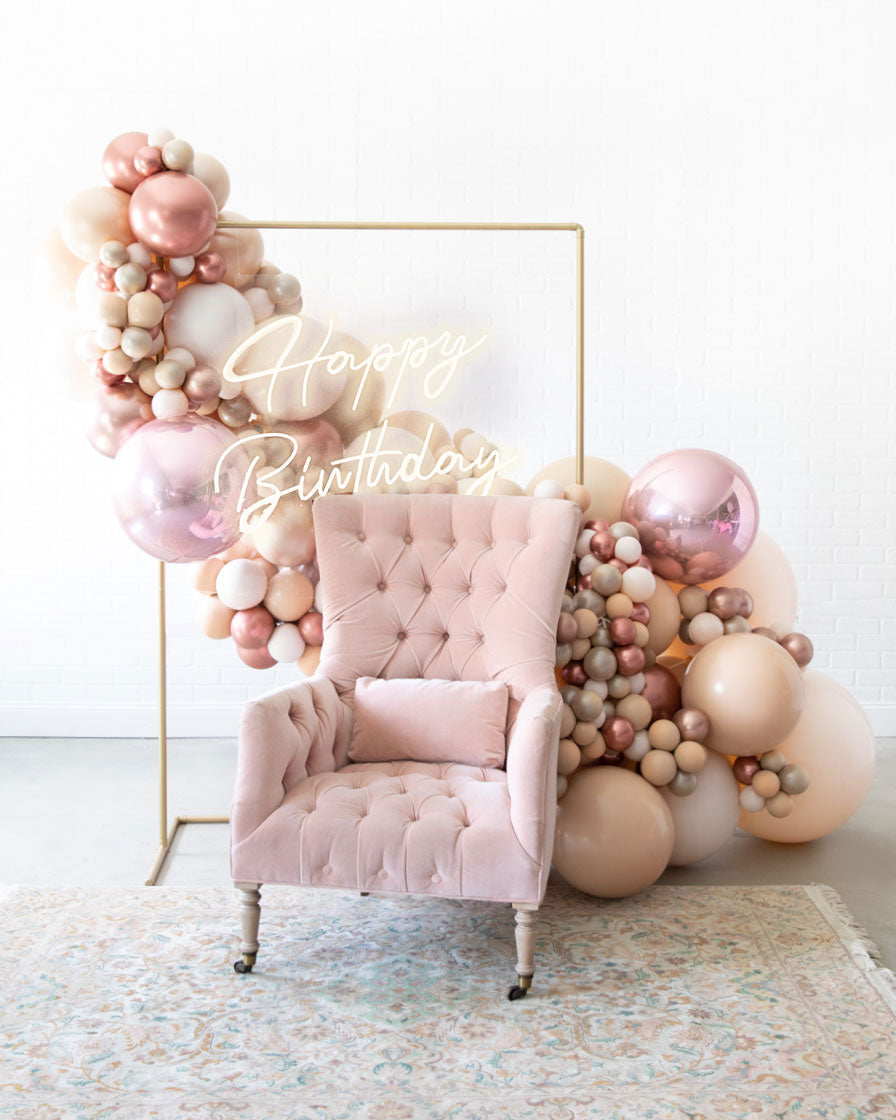 Light up your event with the ultimate backdrop! This balloon garland design includes balloons along a circular frame, as well as a beautiful neon sign to highlight your occasion in style! This works perfectly in any space and will wow your guests!
