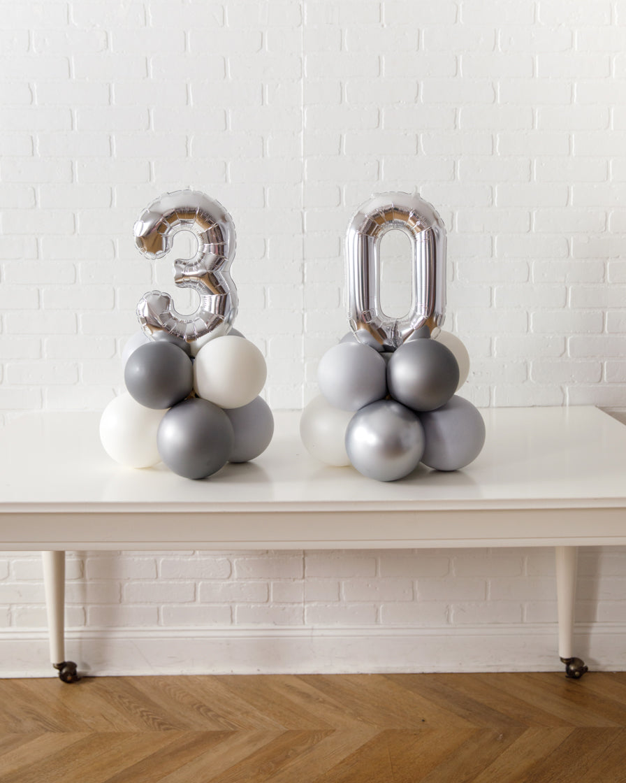 The birthday decor essentials make any room into a party! This set includes tabletop numbers, a giant balloon and floor balloons to transform any space in an instant.