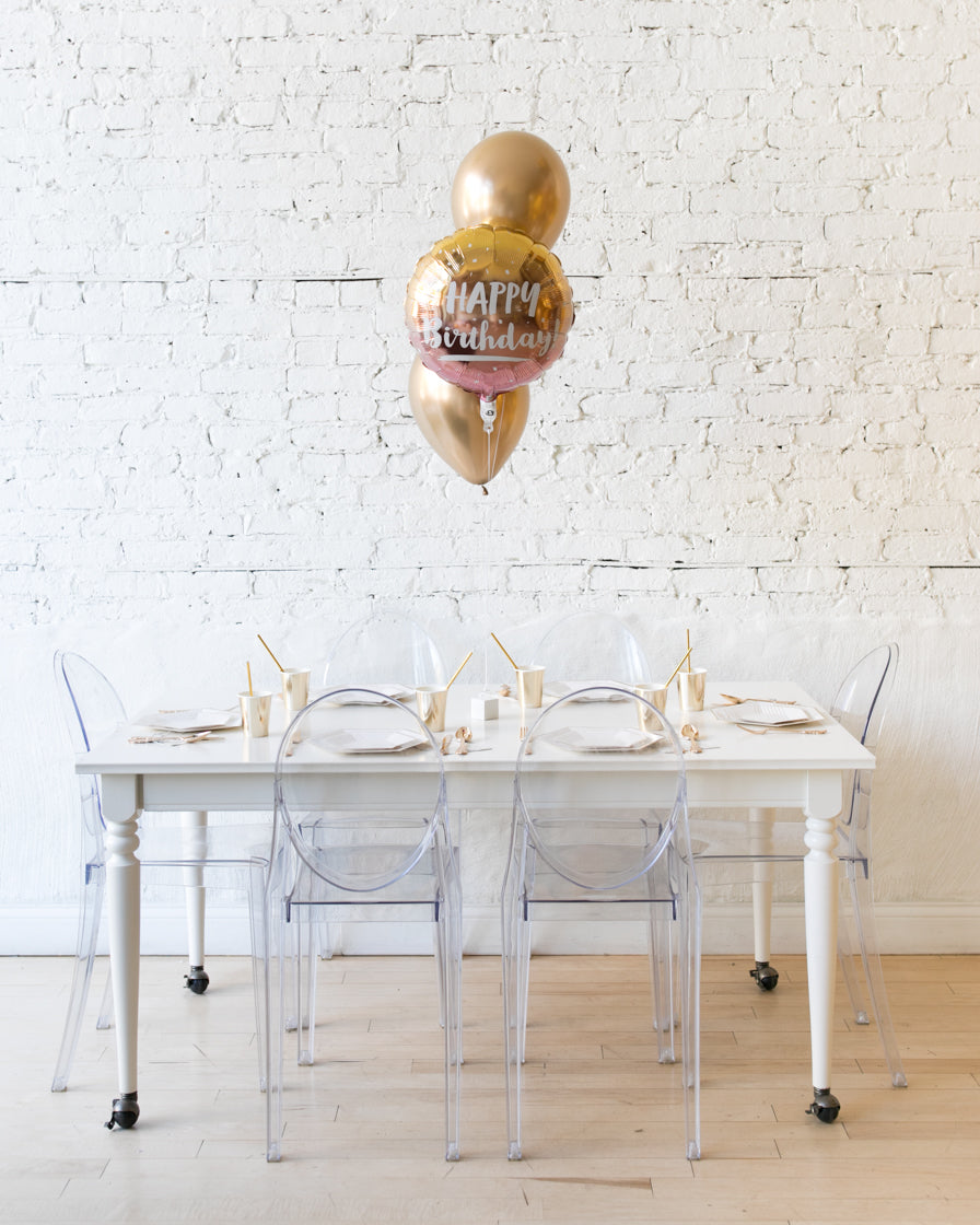 This balloon centerpiece adds a fun touch to your tablescape. Place on dinner table, dessert table, cocktail table or bar cart.
