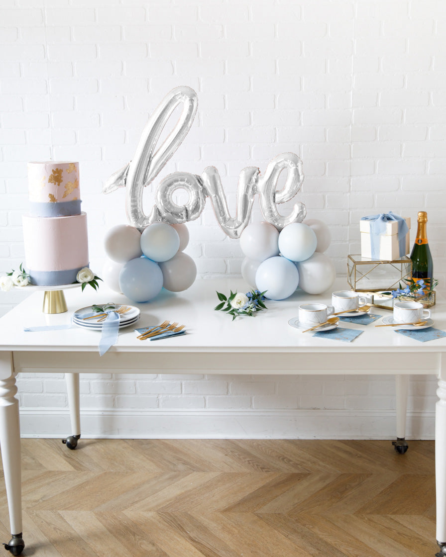 Celebrate love easily and stylishly with a table pedestal. This includes a silver script balloon that can easily be placed on a sweets or gifts table at any bridal celebration.