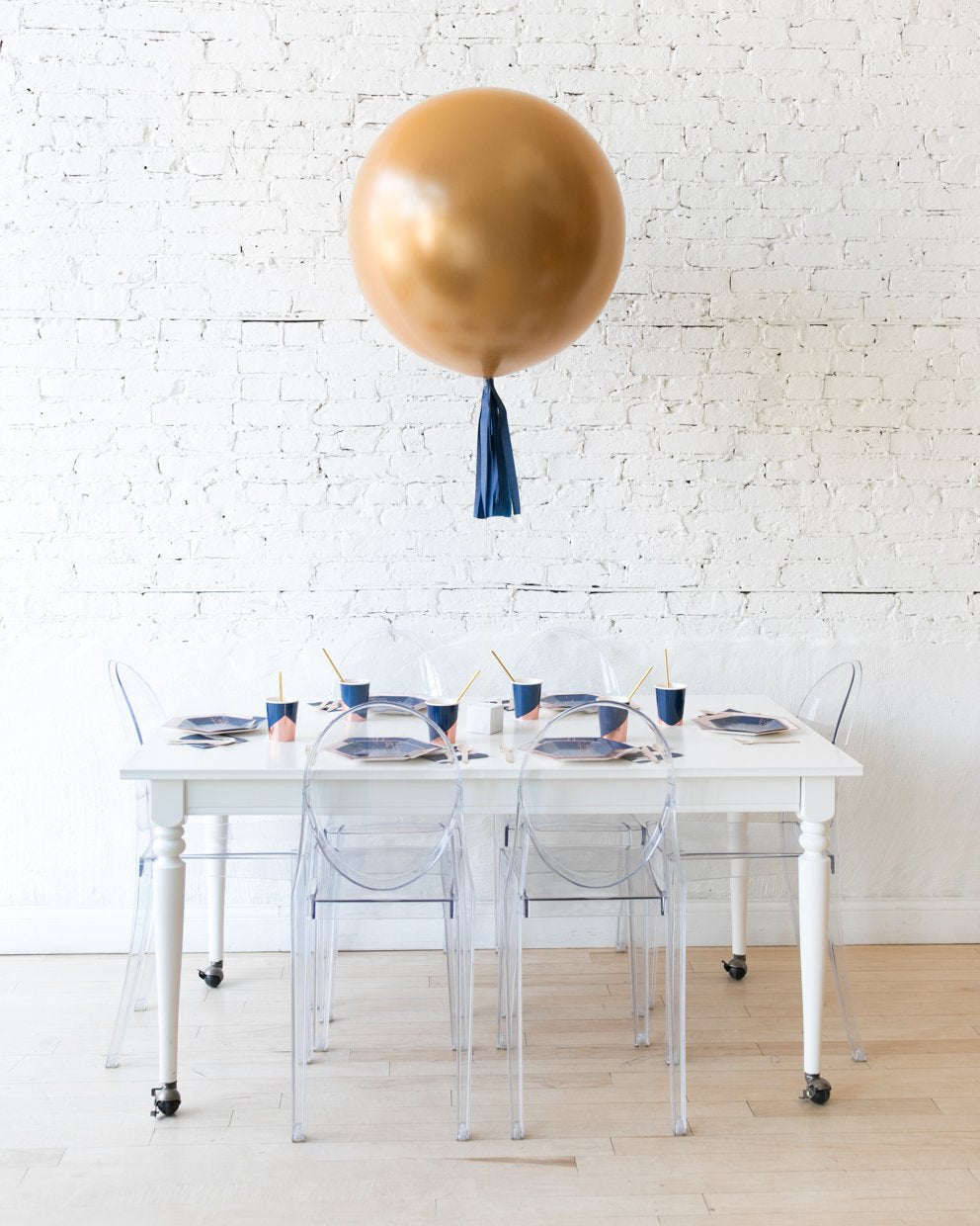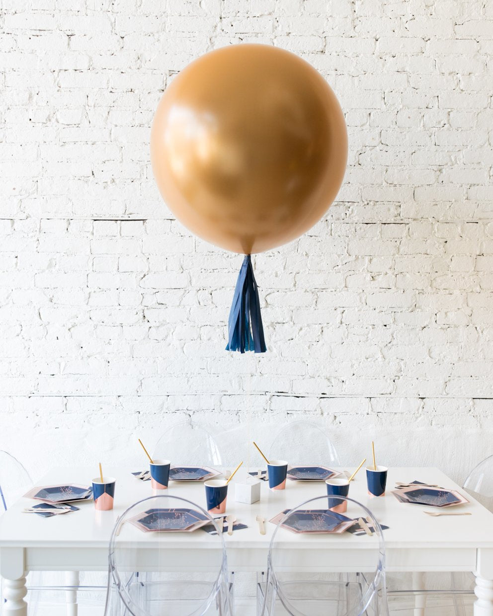 Brass Gold Giant Balloon and Navy Skirt Centerpiece
