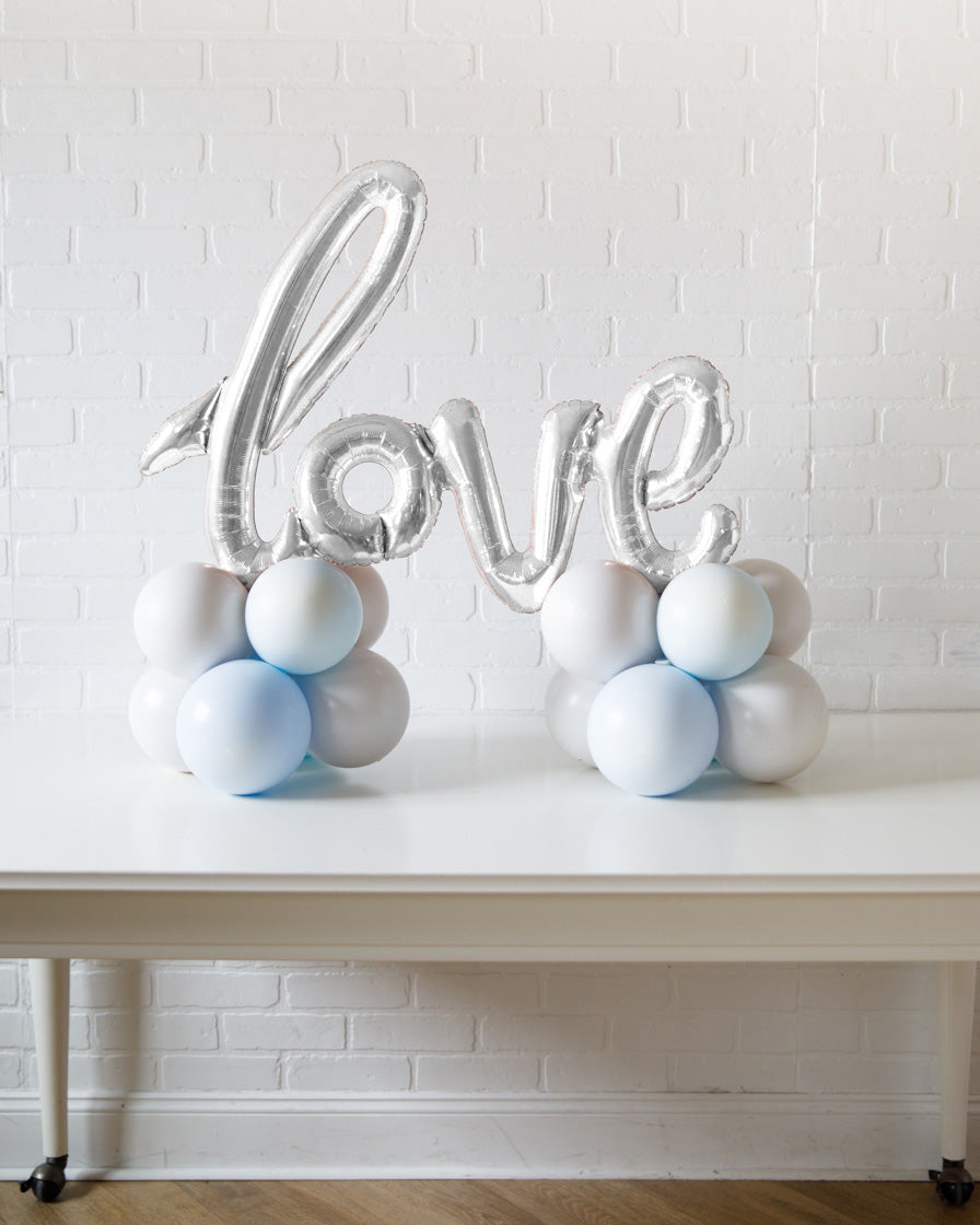 Celebrate love easily and stylishly with a table pedestal. This includes a silver script balloon that can easily be placed on a sweets or gifts table at any bridal celebration.