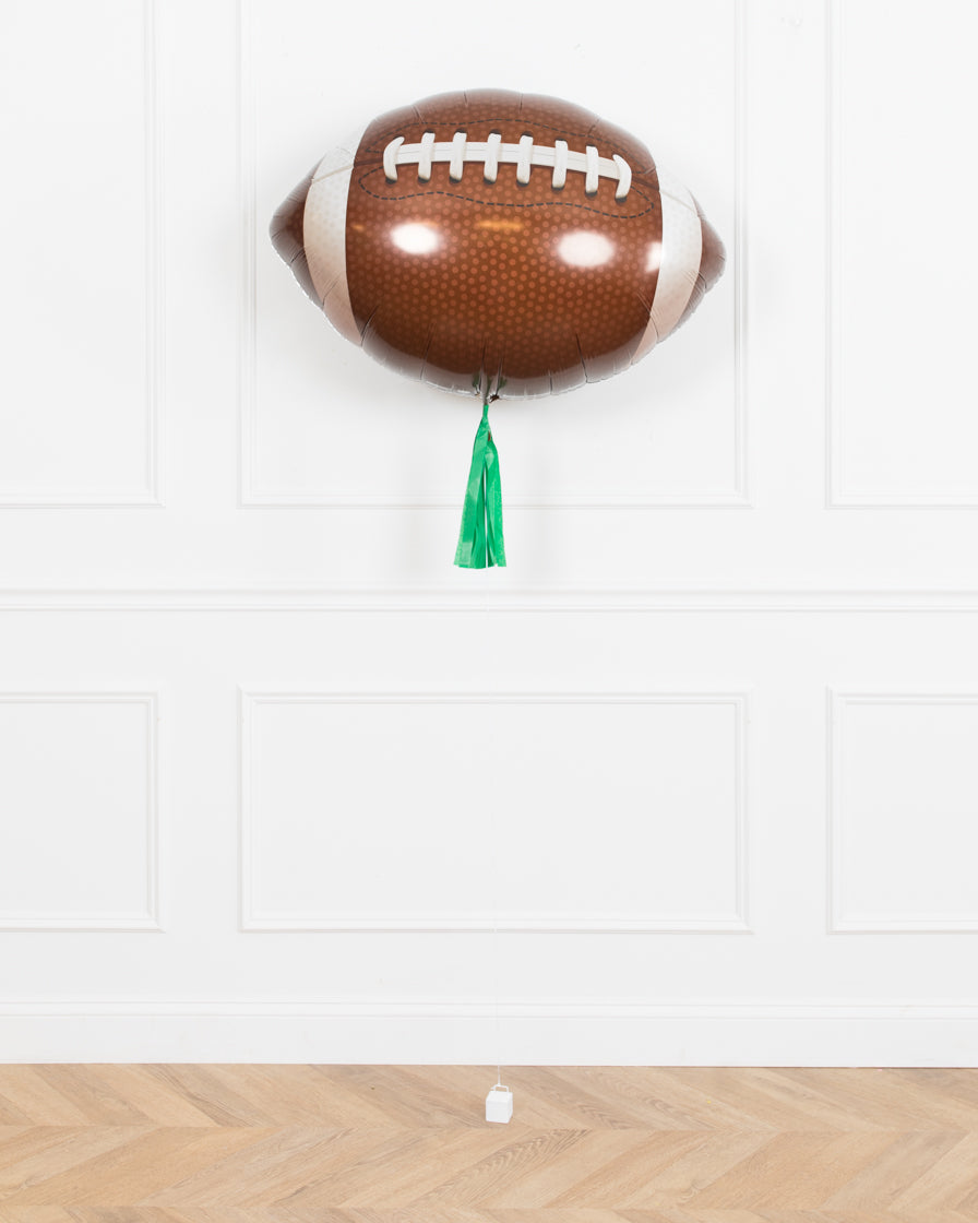 Score Big this football season with our foil football balloon with green tassel skirt! This balloon makes an excellent party decoration for your tailgate, superbowl or playoff game celebration. Add this around your buffet for a festive touch.