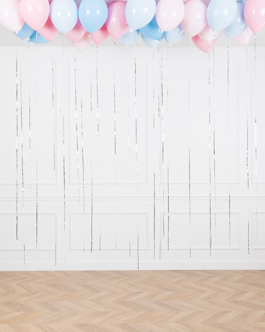 Choose ceiling balloons for a festive gender reveal celebration. These beautiful helium-filled balloons finished with silver streamer can truly transform any space.
