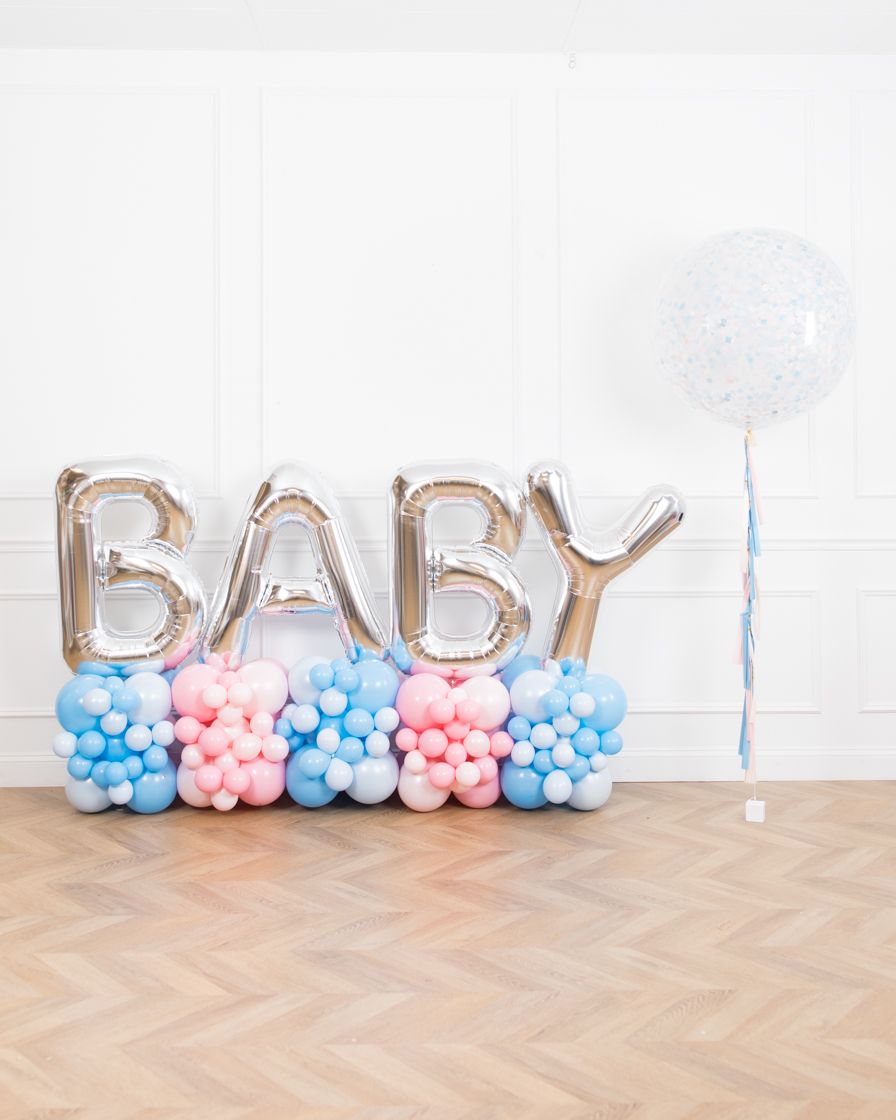 Make a bold and beautiful statement for classic gender reveal! Use this giant balloon with tassel garland and baby pedestal to dress up any space! This design includes colorful balloons to make a gender reveal shine!
