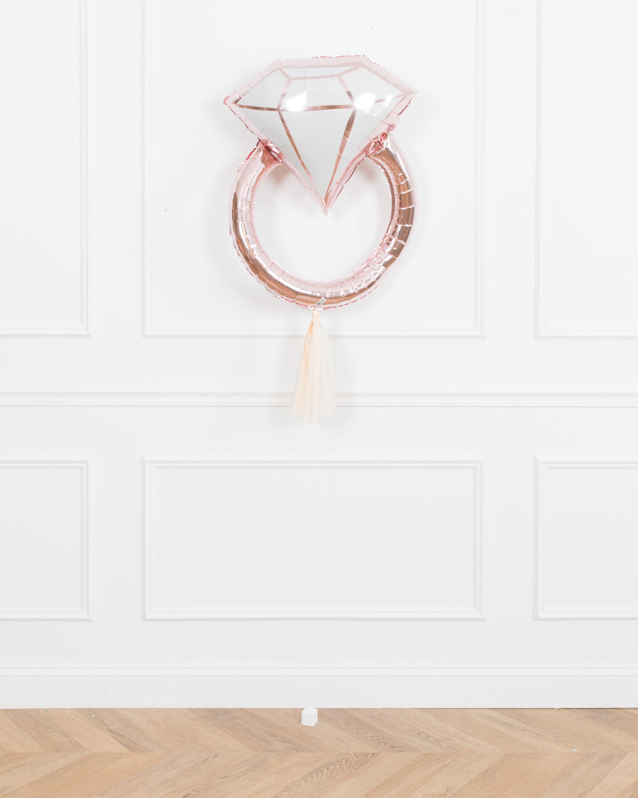 This rose gold diamond ring foil balloon is a picture perfect balloon decoration. Dressed with a blush skirt, this piece is an easy way to decorate your bridal shower.