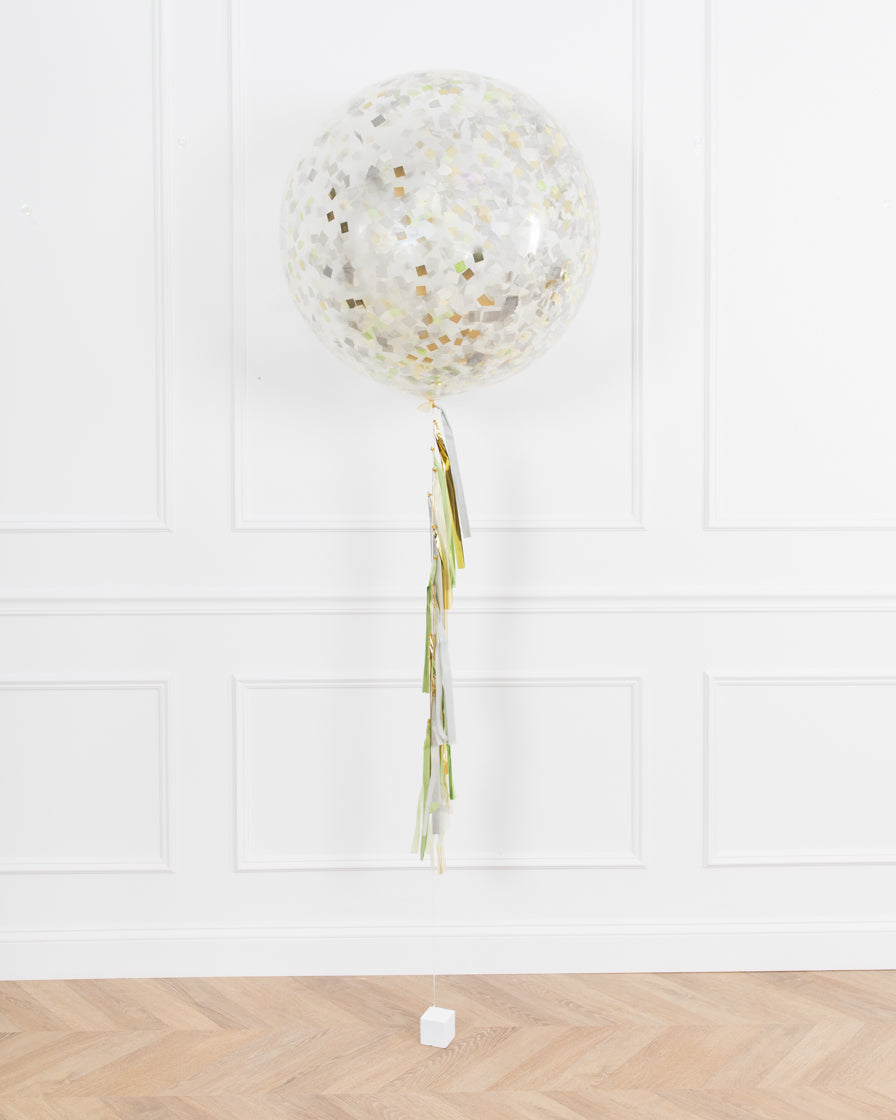 This confetti giant balloon is perfect for any themed shower. This helium-filled giant balloon is filled matching confetti and finished with matching tassel.