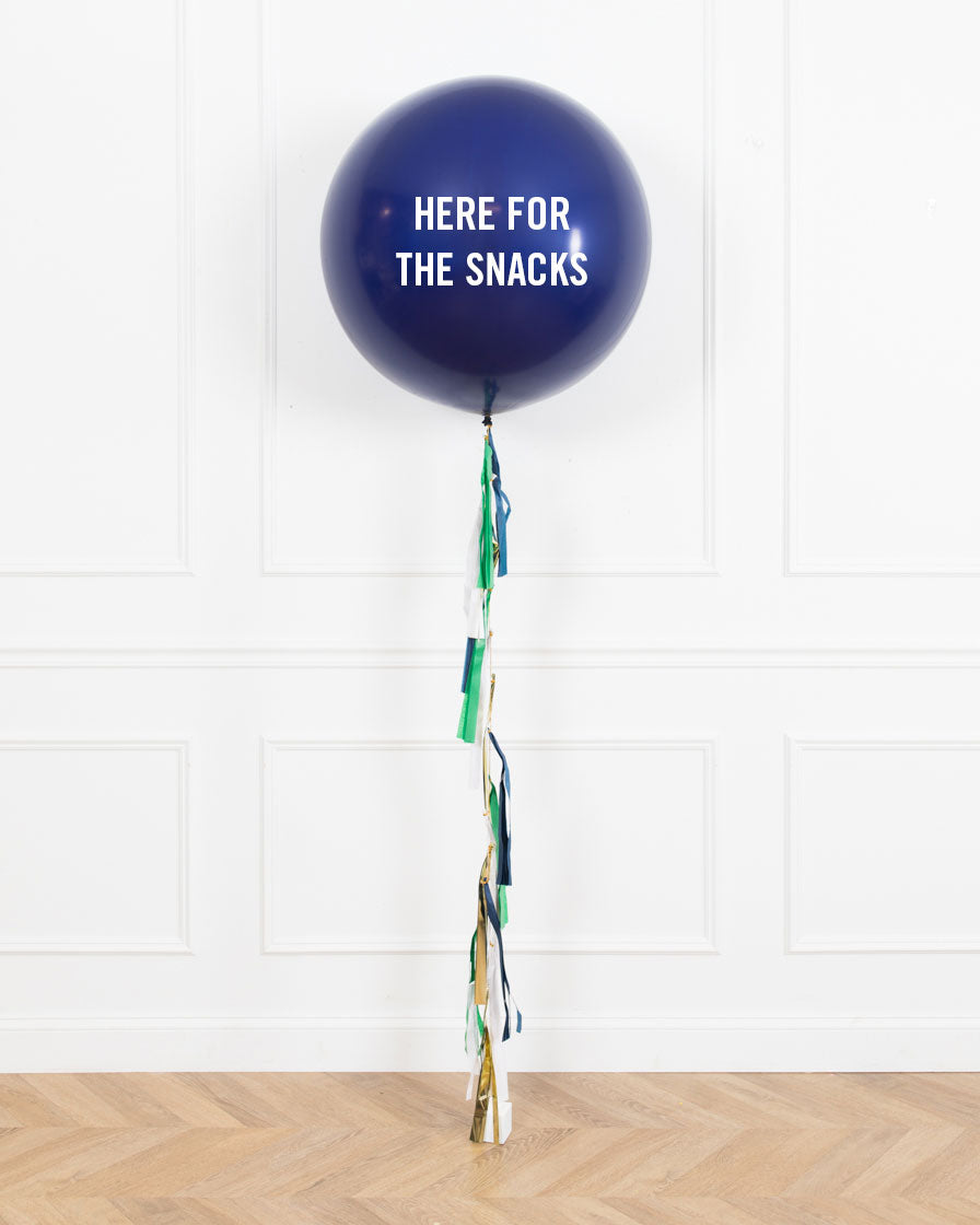 Show your Super Bowl style with this fun message giant balloon! With a fun "Here for the Snacks" message, your guests will love this decoration. Customize the colors for your NFL team for extra festive fun.