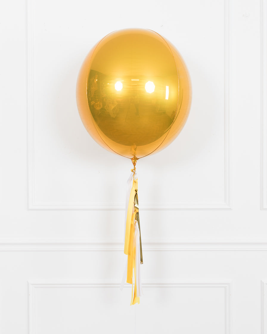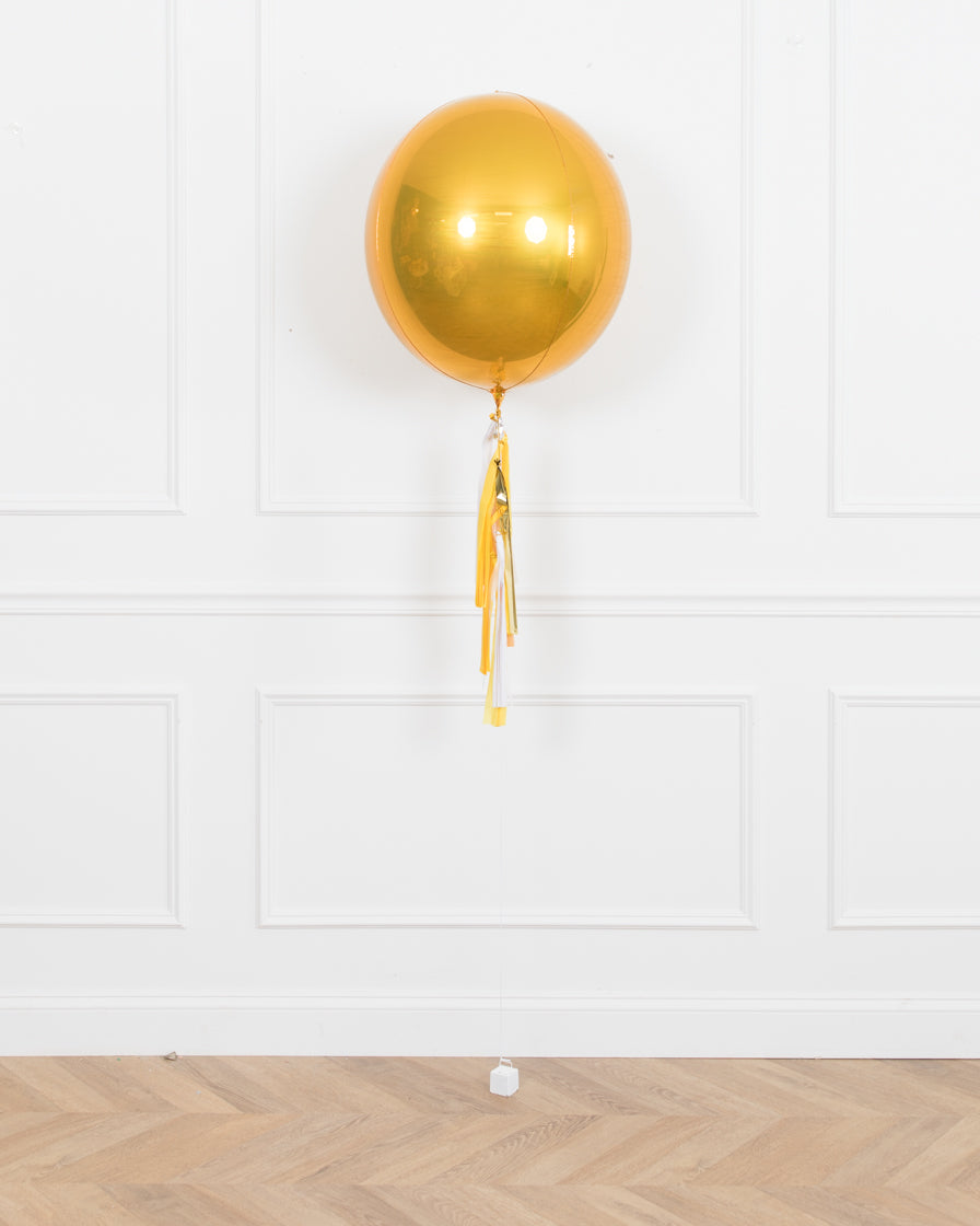 An elegant option that always makes an impression. This helium-filled gold orb balloon with tassel garland is an easy way to decorate a shower.