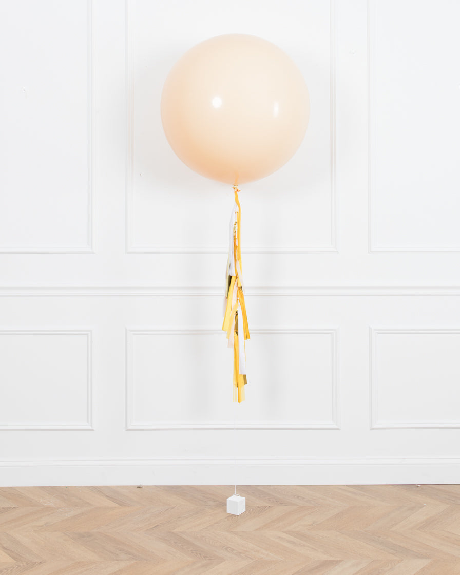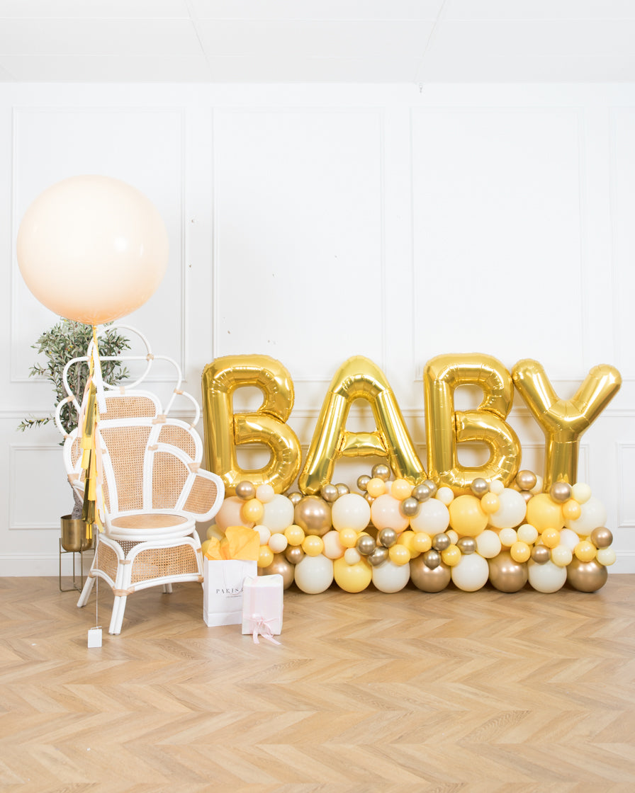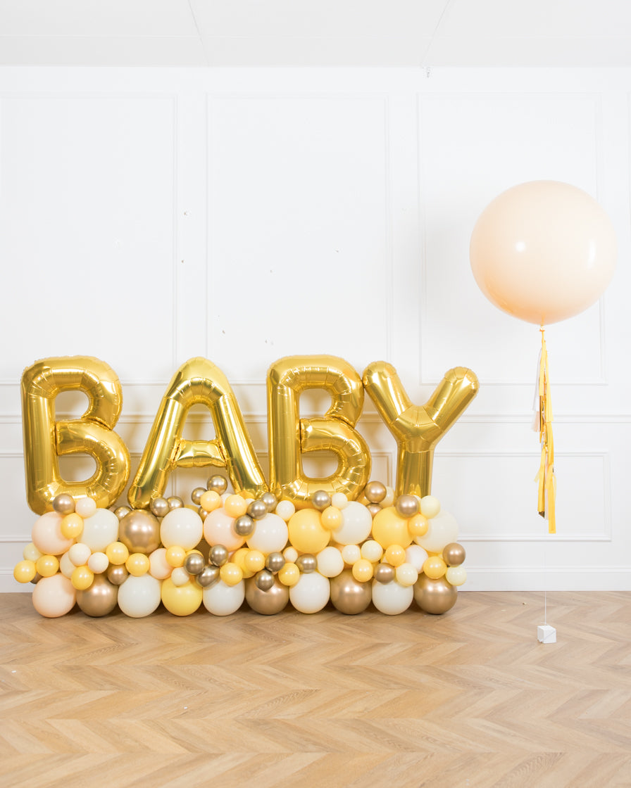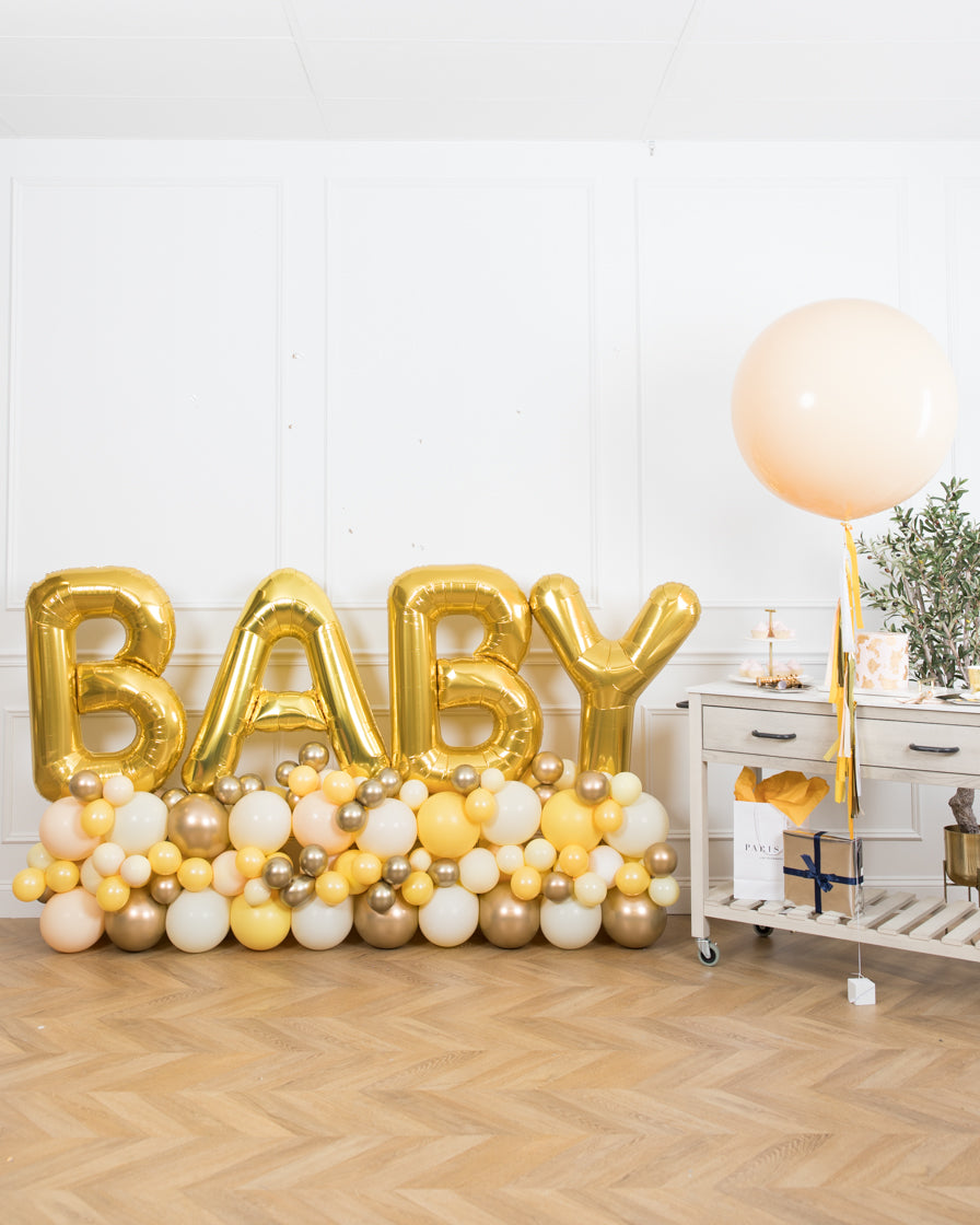 Make a bold and beautiful statement for bumblebee themed shower! Use this giant balloon with tassel garland and baby pedestal to dress up any space! This design includes gold letters and bumblebee inspired balloons.