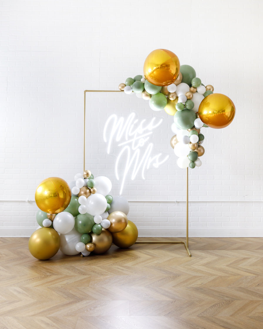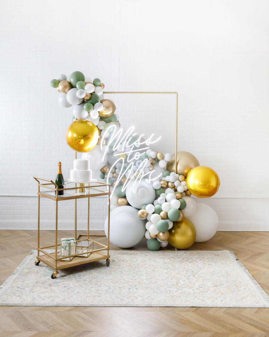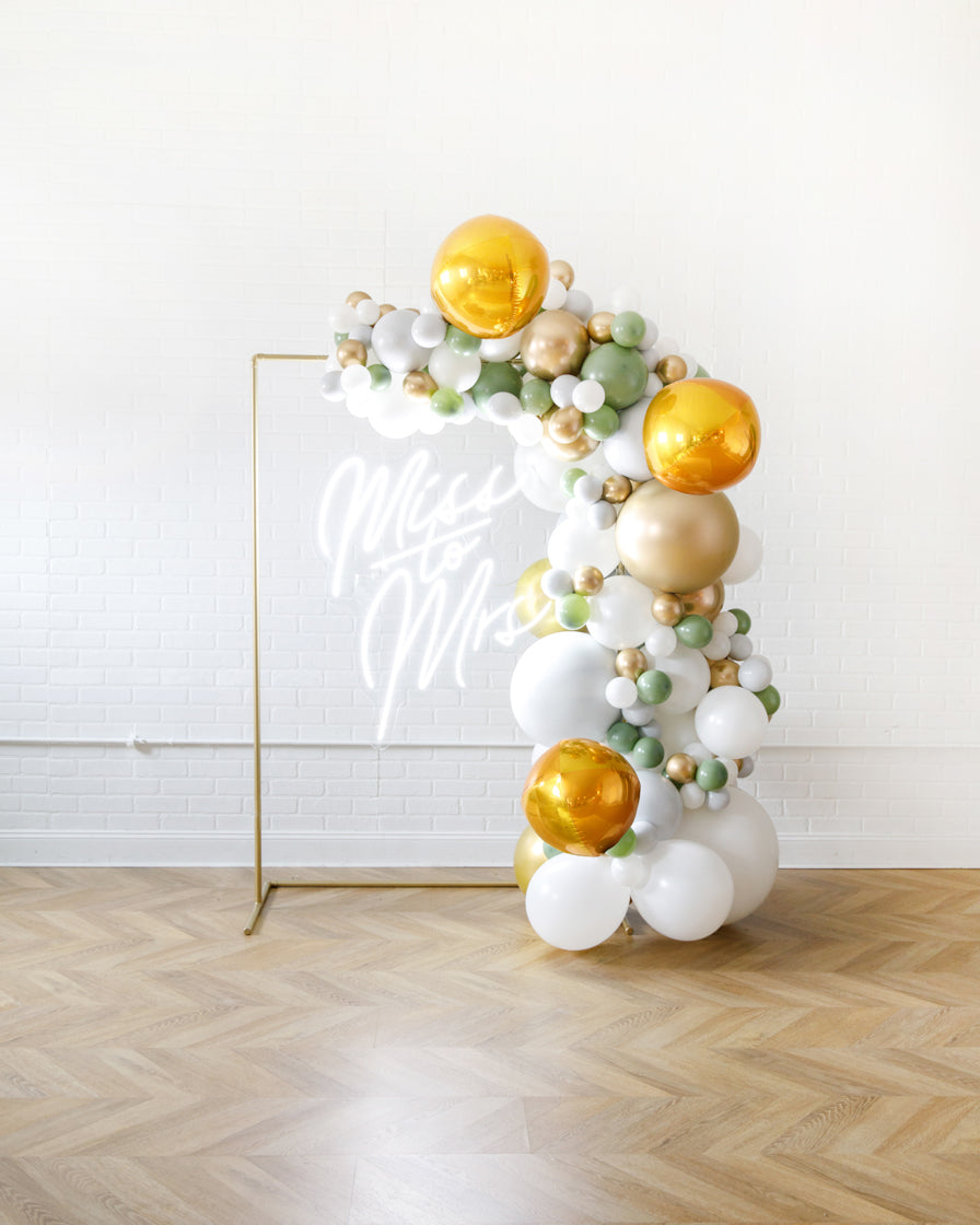 Light up your event with this neon sign, frame and balloon garland set! This picture perfect backdrop includes our Miss to Mrs neon sign, and an overflowing balloon garland draped around our small gold frame that creates a beautiful backdrop.