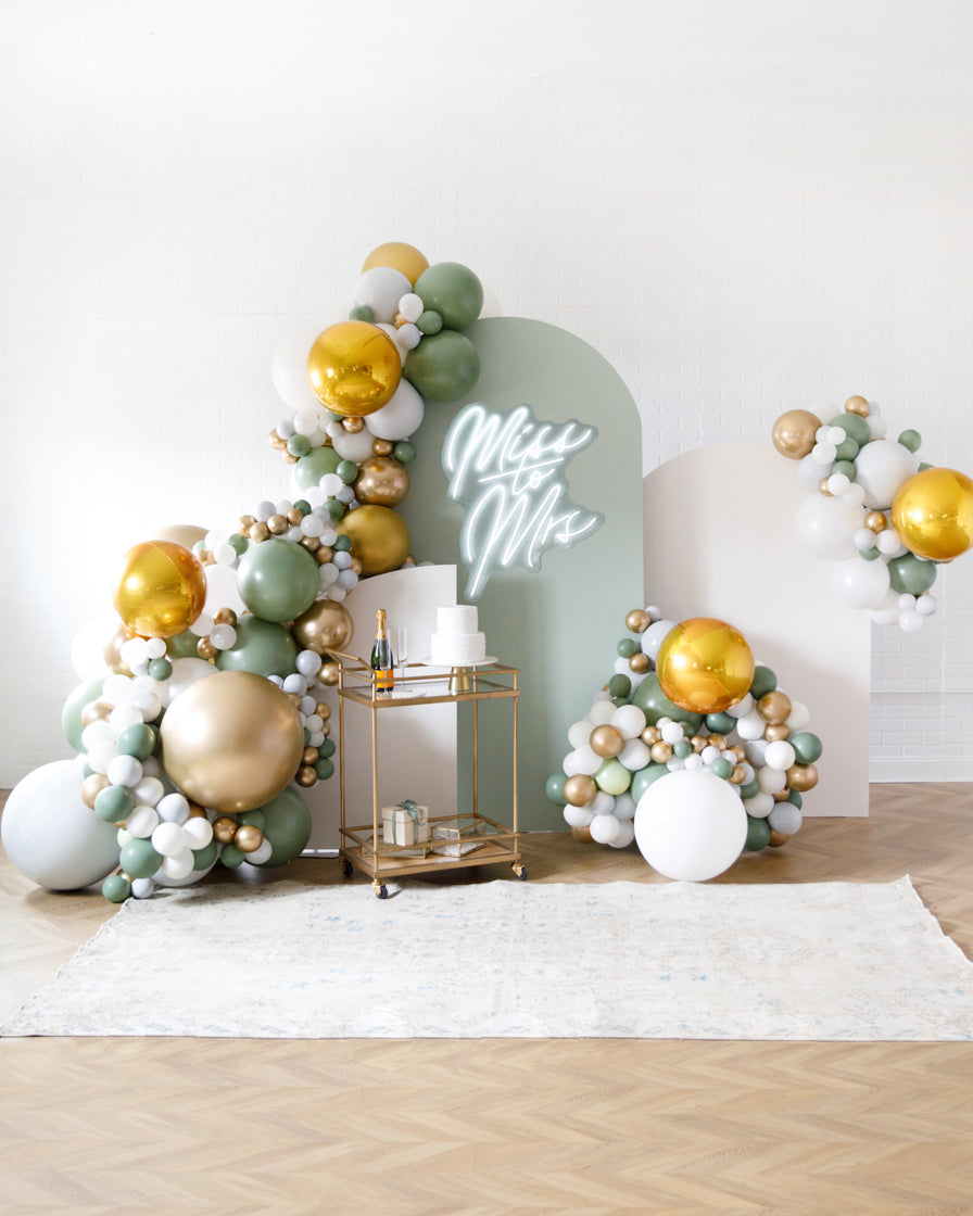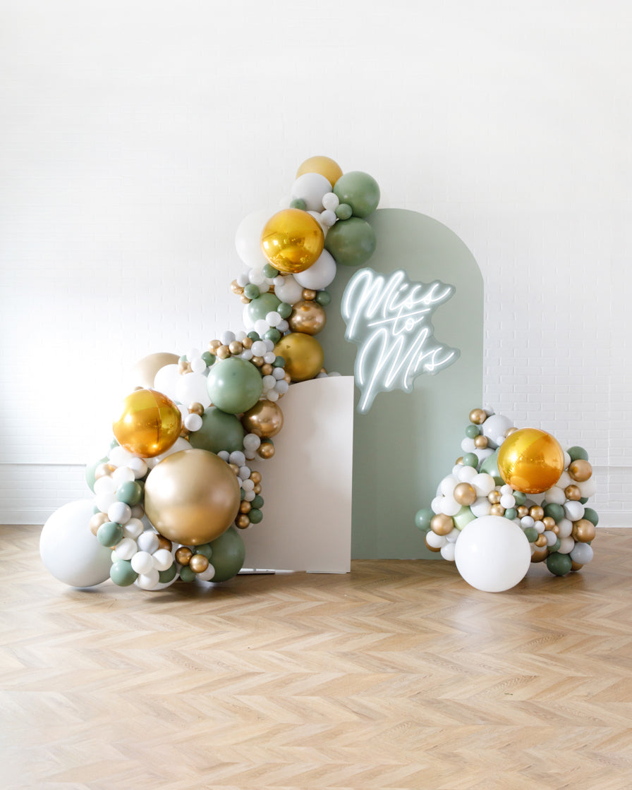 Stand out in style with this panel and balloon garland design. This includes a 2 panel backdrops, neon Miss to Mrs sign and oganic balloon garlands to match. Add foil accents to make your Photo Backdrop stand out even more!