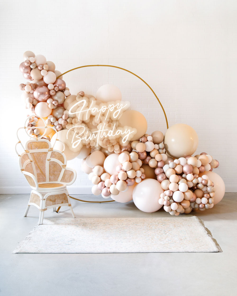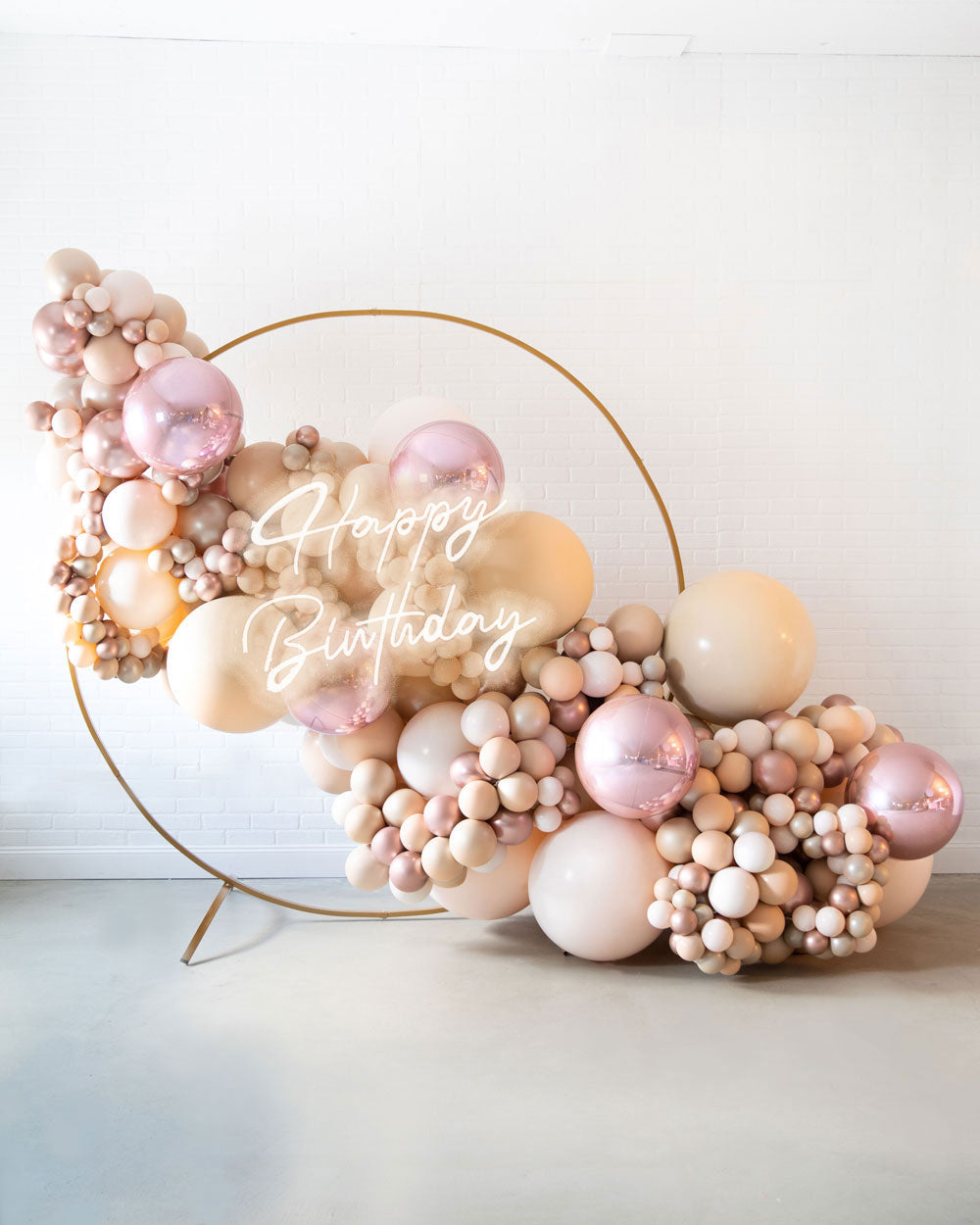 Light up your event with the ultimate backdrop! This balloon garland design includes balloons along a circular frame, as well as a beautiful neon sign to highlight your occasion in style! This works perfectly in any space and will wow your guests!