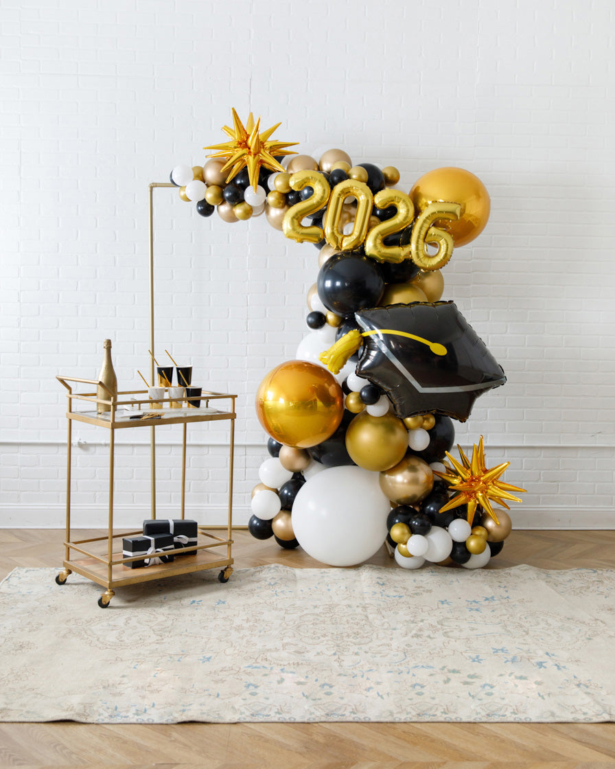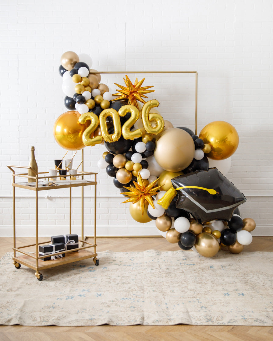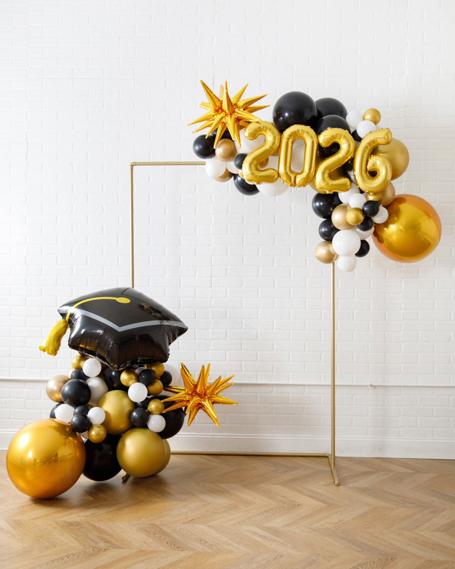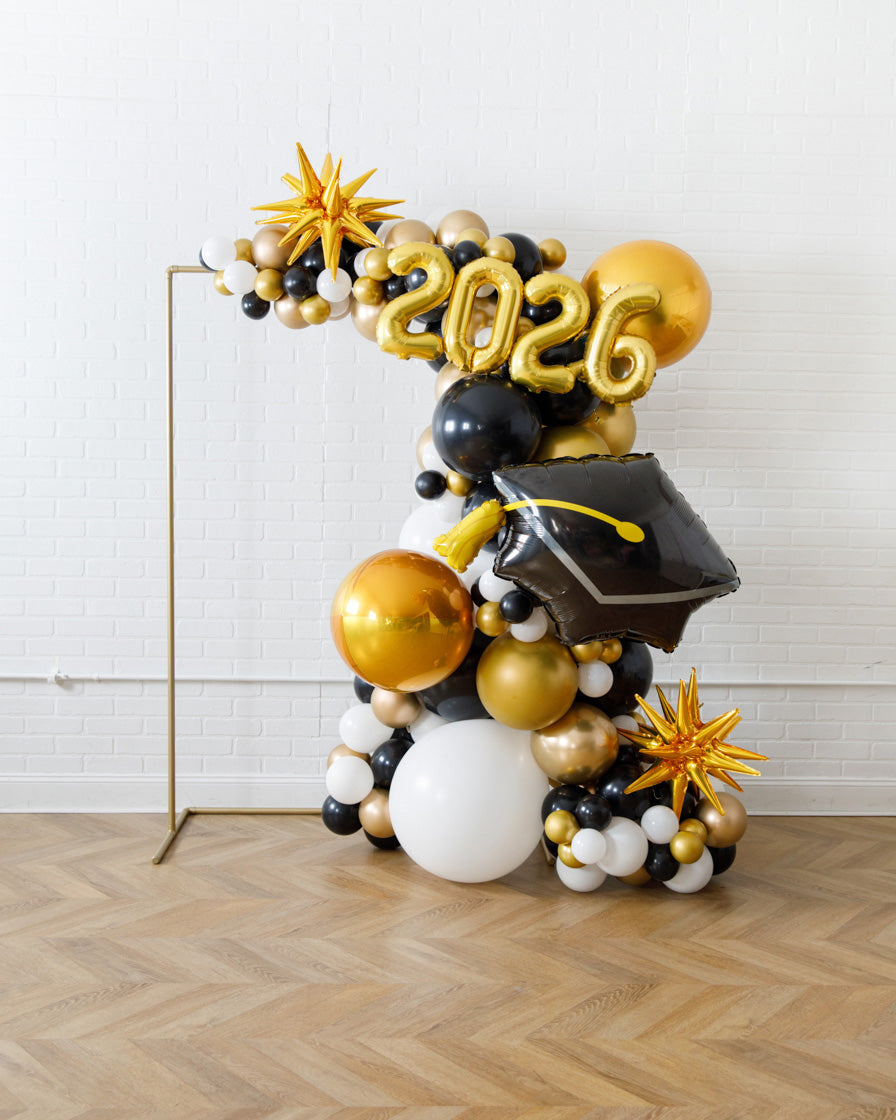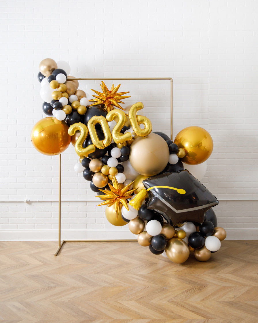 Instantly transform your graduation with our 4x6 frame and balloon garland design! This organic garland drapes around our signature gold frame for a one of a kind look! Bring even more glam to the look with foil accents.