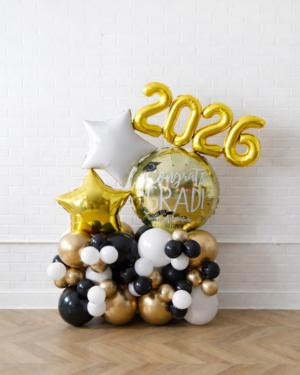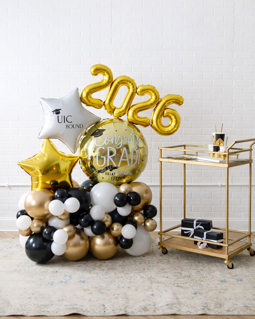 Celebrate your 2025 Grad with a picture perfect pedestal! Perfect for decor or a gift, this includes a giant graduation message foil and metallic stars for a one of a kind look. Personalize with school colors to really make this a special celebration.