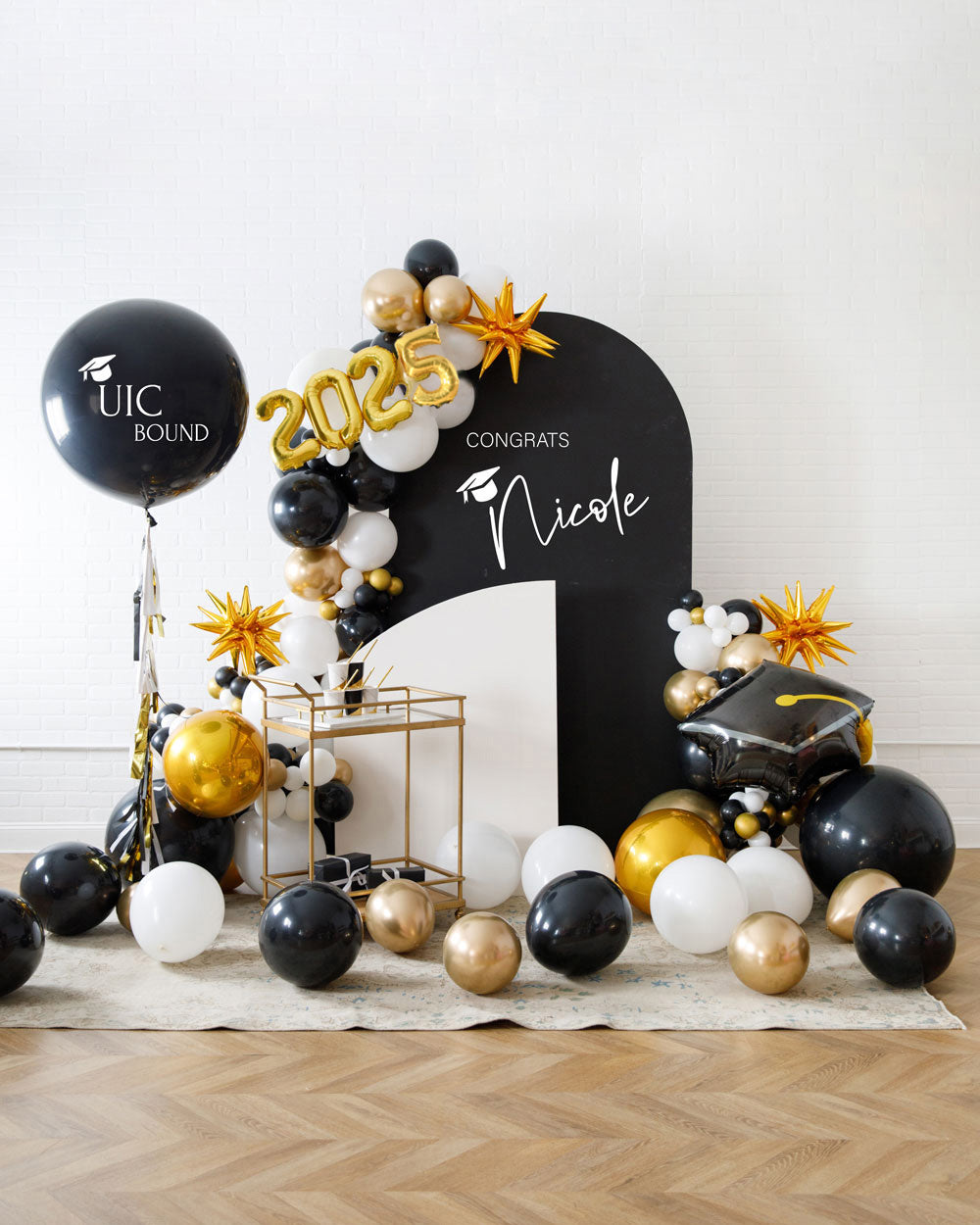Wow your guests with this sophisticated and stylish backdrop for your graduation celebration! With two panels, a balloon garland, and giant balloon, this will be the ultimate backdrop. Choose colors to create the ultimate display of school spirit.