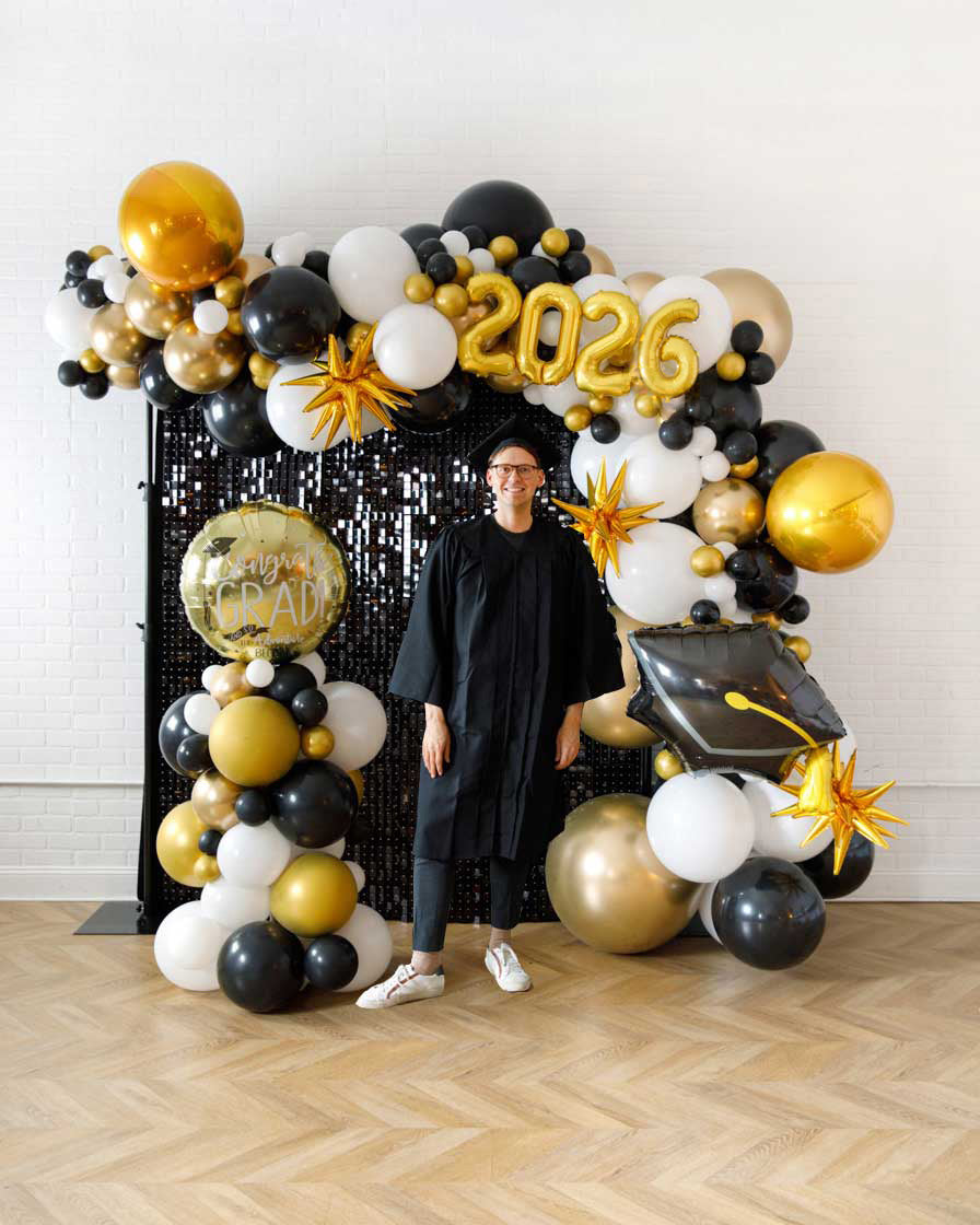 Let them shine on their graduation with our balloon garland and shimmer wall set! This includes a graduation balloon column balloon garland and black shimmer wall, perfect for a over the top graduation celebration.