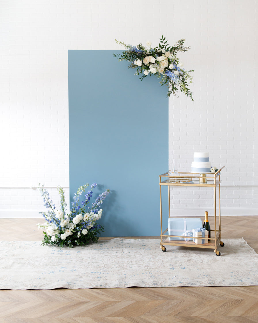 Create a breathtaking moment for your bridal celebration with this panel and floral design. With unique floral centerpieces, and the option to add a balloon garland, you guest will fall in love with this unique backdrop.