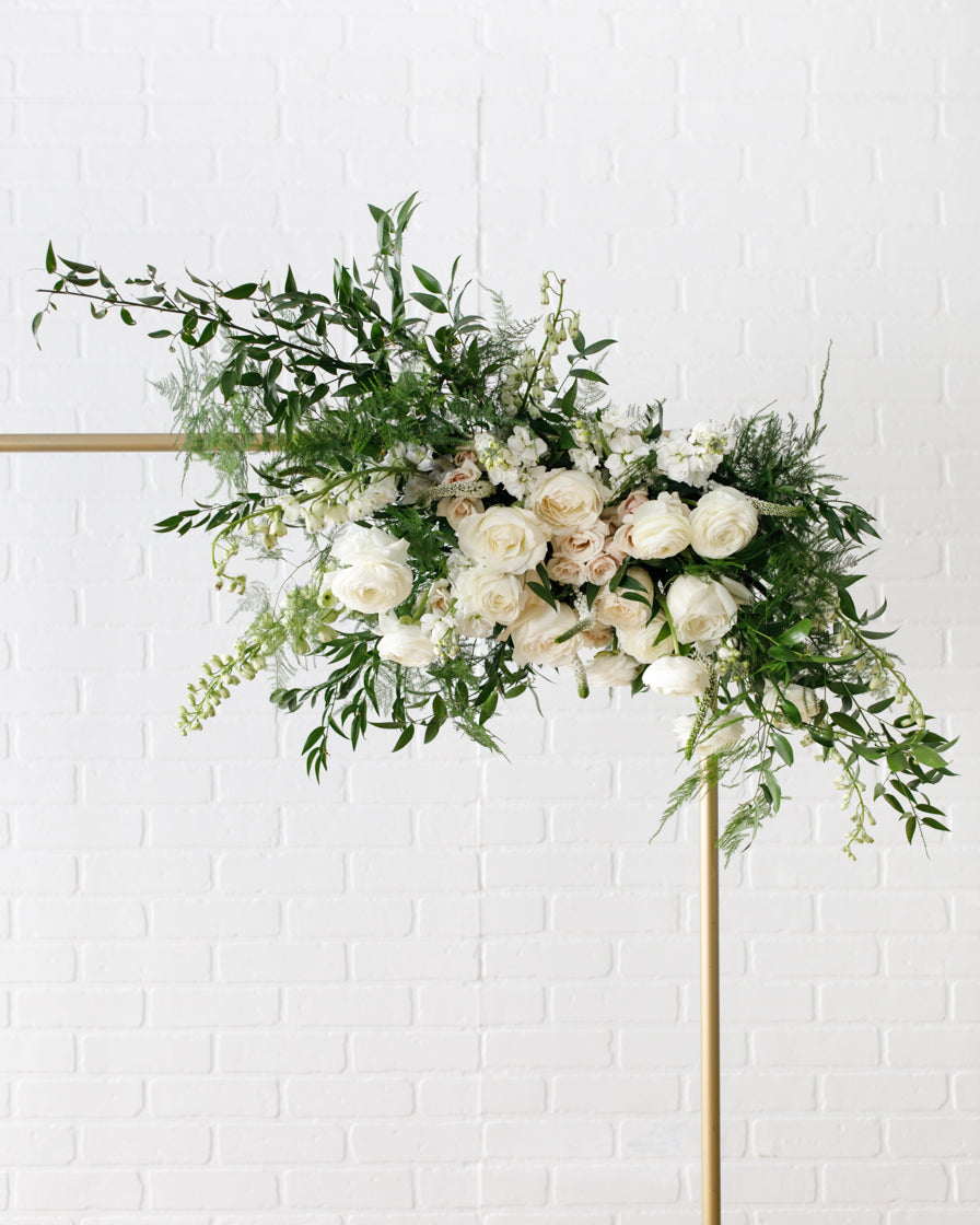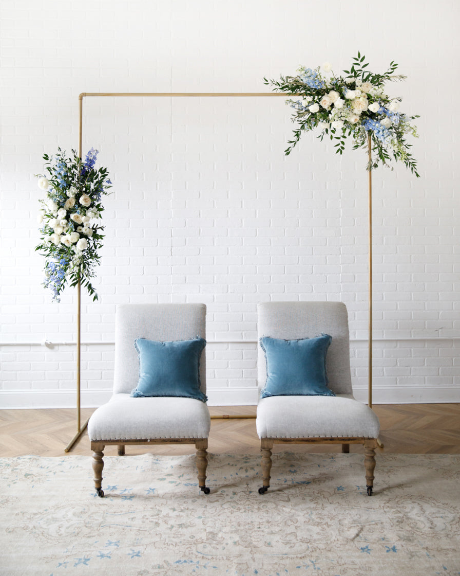 Elevate your event with this frame and floral pair. With our signature gold frame and two statement making floral arrangements, this works perfect for a Photo Backdrops, gift opening, or an entryway.
