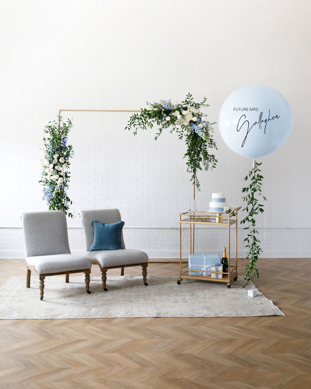 A statement that will take you and your guests breath away! Our signature gold frame with floral adornments, and a giant balloon with greenery and personalized message, help make your big day will be simply stunning.