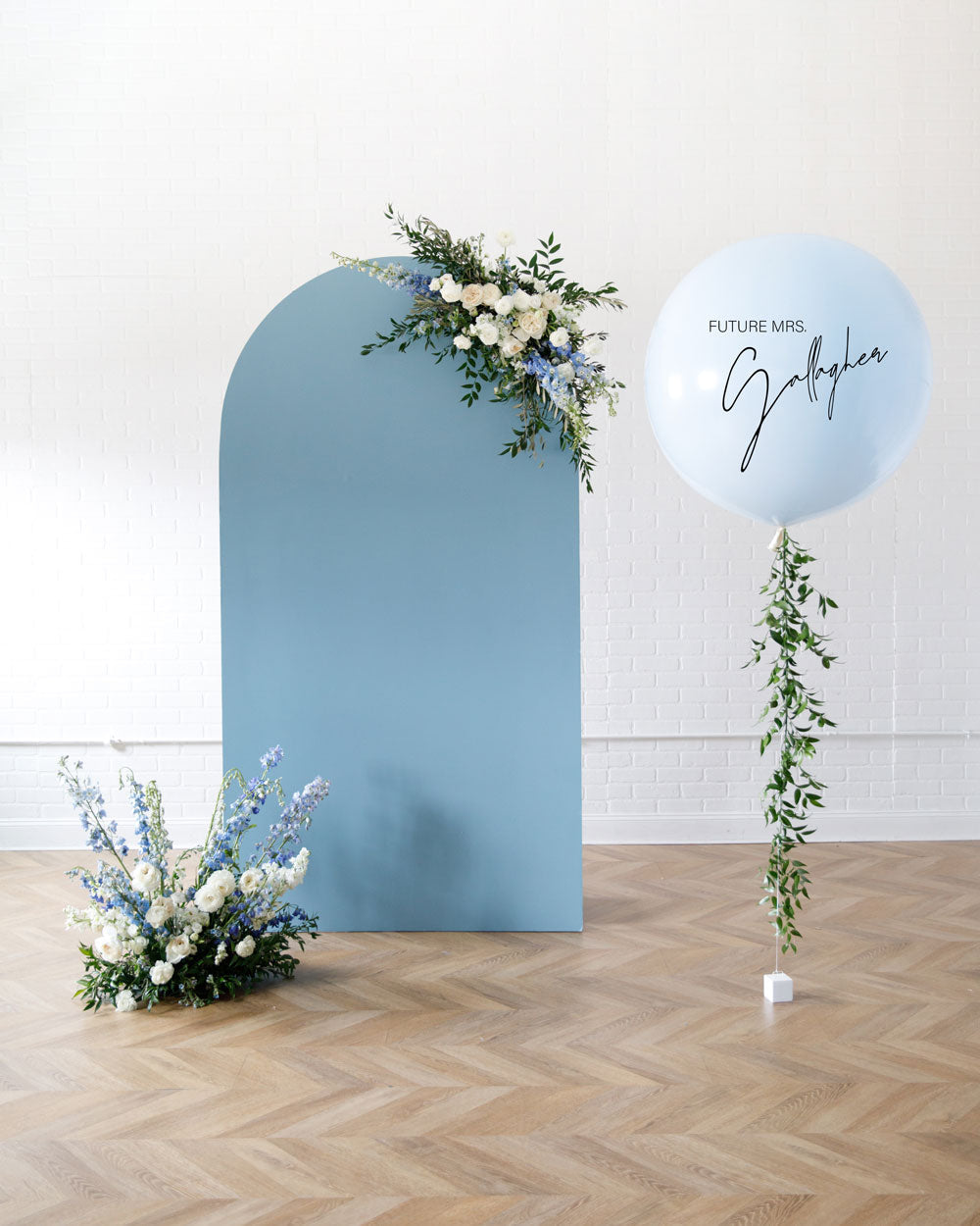 Let your bridal decor shine with our signature Bellamy Panel design. This includes a 7ft panel backdrop with an organic floral arrangement and one floral burst to match. A Giant with greenery and custom message completes the look.